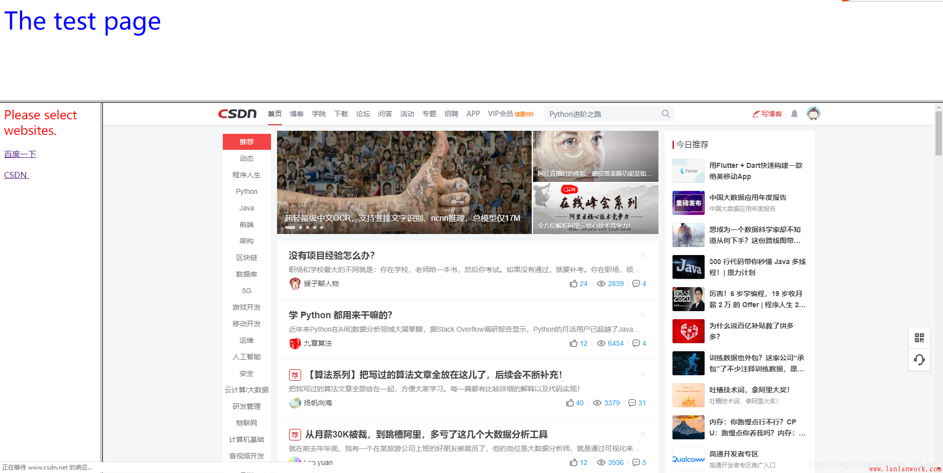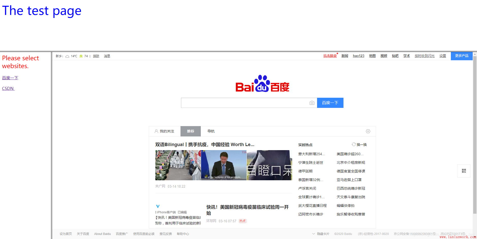 <!--selection_bar--> <html> <head></head> <body> <font size="5" color="red"> Please select websites. </font> <br /><br /> <a target="output_page"/>百度一下<br /><br /> <a target="output_page"/>CSDN <br /><br /> </body> </html>