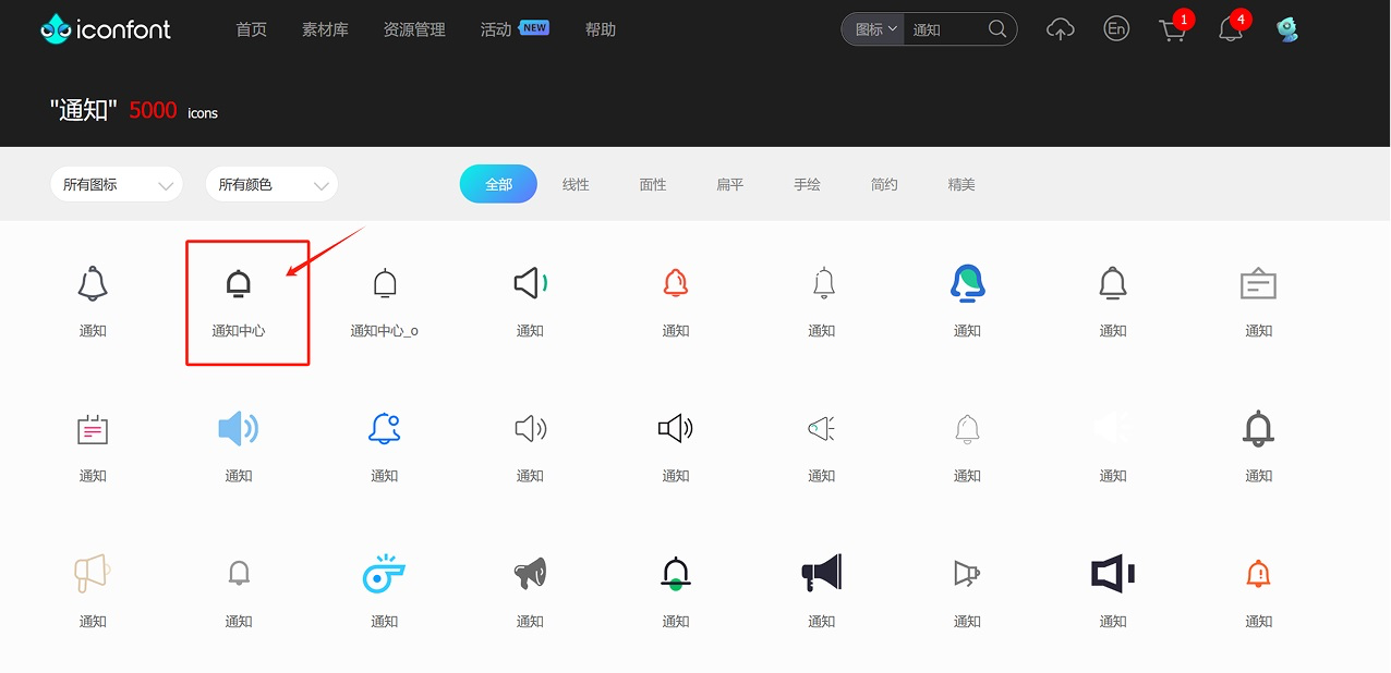 我就拿最常用的阿里巴巴圖標(biāo)庫,打開網(wǎng)址,找通知圖標(biāo),直接下載第一頁,第 1 排第 2 個(gè):