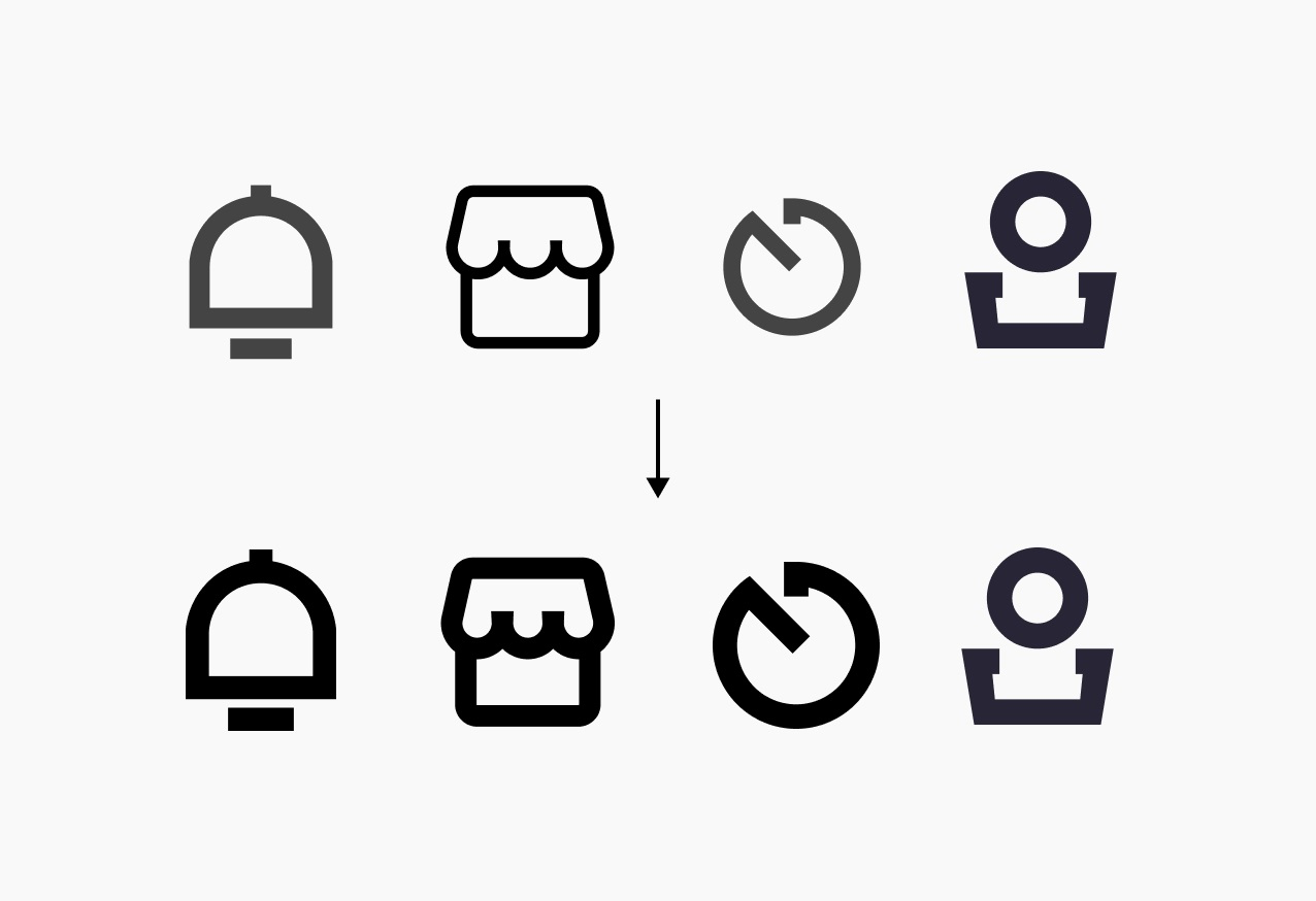 有了素材之后,我們首先要讓他們看起來是一套的,所以在統(tǒng)一性上需要優(yōu)化,先優(yōu)化大小和線條粗細(xì):