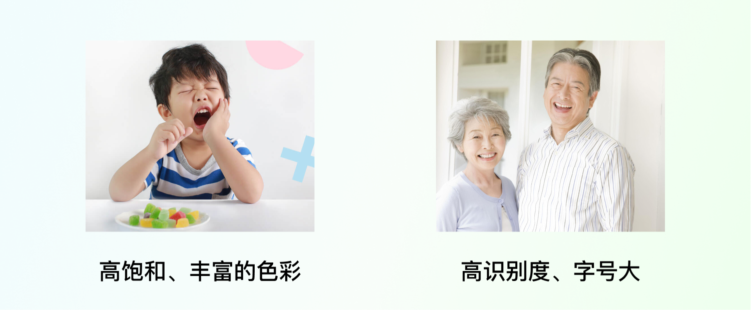 小孩喜歡高飽和、豐富的顏色,而老人則需要考慮在各種場(chǎng)景下都能看得清楚信息的顏色。