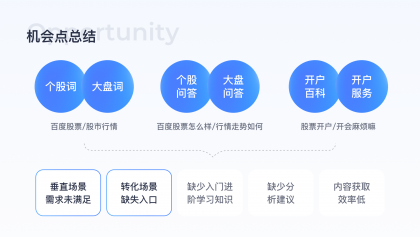 分析需求:典型搜索詞股票開戶等轉(zhuǎn)化詞,線上僅有開戶入口列表,但實際搜索用戶有潛在的查找開戶方式需求未滿足,因此需先滿足用戶了解開戶流程的需求,再提供轉(zhuǎn)化入口。