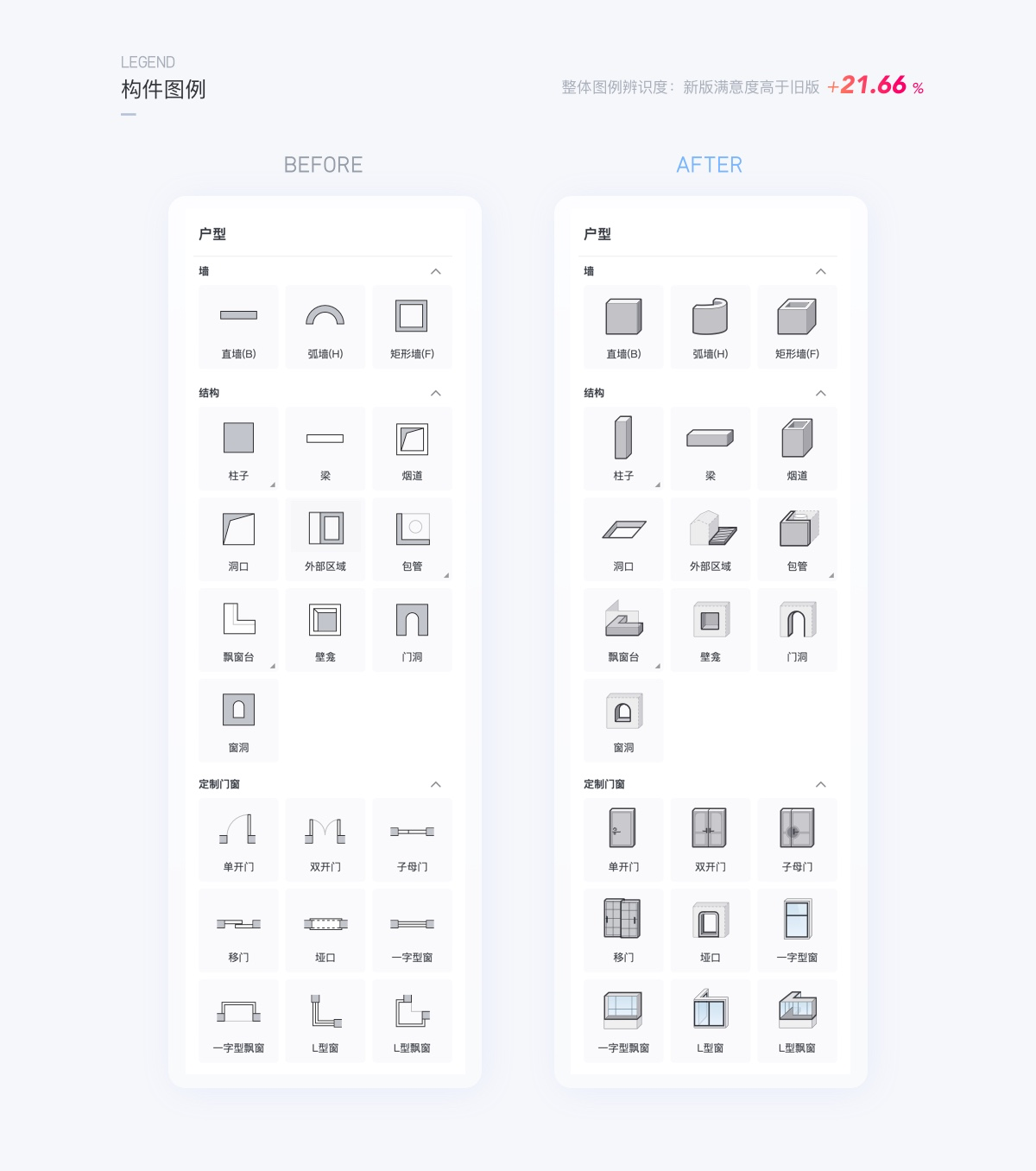上線后通過問卷調(diào)研用戶滿意度相比舊版提升了21.66%,因此可以證明,更精準(zhǔn)的圖形輔助用戶更高效的使用工具操作。以上是項目小組在試驗過程中的部分案例,不再一一列舉所有的試驗案例,可以看到信息表達(dá)的精準(zhǔn)度、直觀度是能夠?qū)I(yè)務(wù)產(chǎn)生直接的正向結(jié)果,鑒于群核下的工具產(chǎn)品有大量的應(yīng)用圖標(biāo)圖例,借此我們重新排查和校準(zhǔn)了很多圖標(biāo),確保表達(dá)相對精準(zhǔn),提高用戶信息識別的精準(zhǔn)度與效率。
