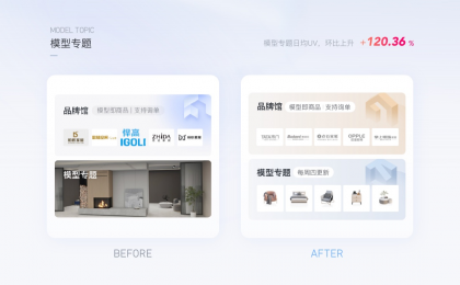 群核下的設(shè)計工具,以專題化的形式聚類商家、平臺推薦的模型是基本的運(yùn)營動作,如下圖,原本以真實效果圖的方式展示模型專題,用戶難以感知是方案還是模型。通過封面圖形的優(yōu)化:將核心的模型類型展示出來,用戶能夠預(yù)見里面的內(nèi)容。