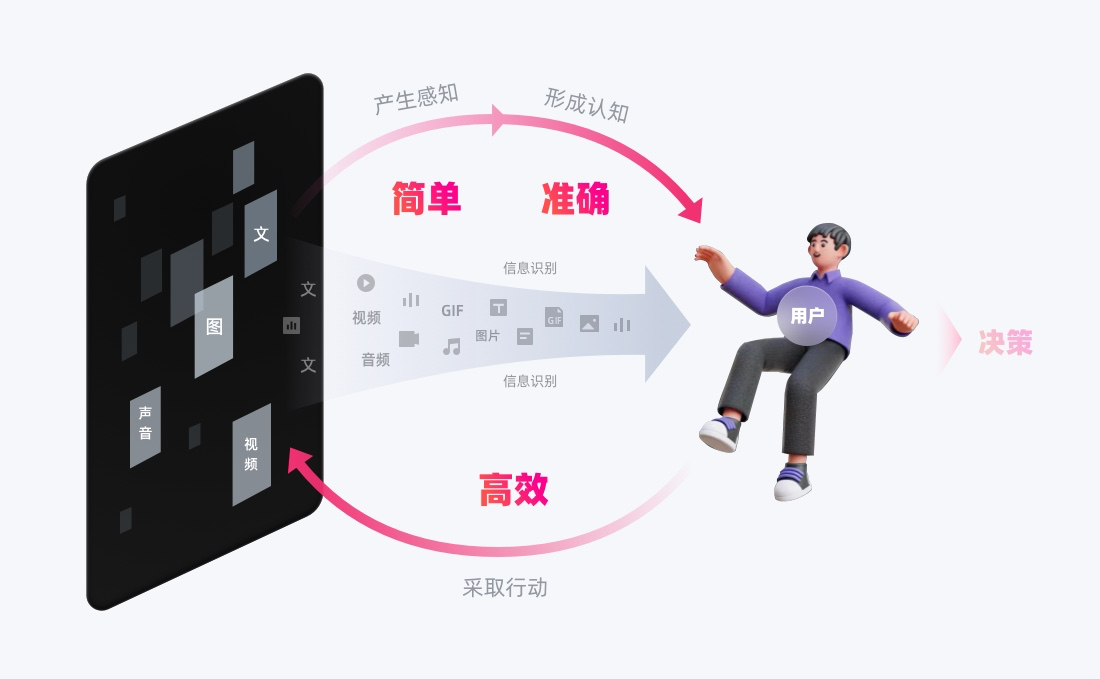 信息識別,可簡單理解為:感知到(看到/聽到)信息,并能夠理解它。本質(zhì)是在用戶與界面交互中,會經(jīng)歷「感知信息→認(rèn)知信息→做出決策與行動」的歷程,從感知到認(rèn)知,是信息獲取和辨識理解的過程,即「信息識別」。