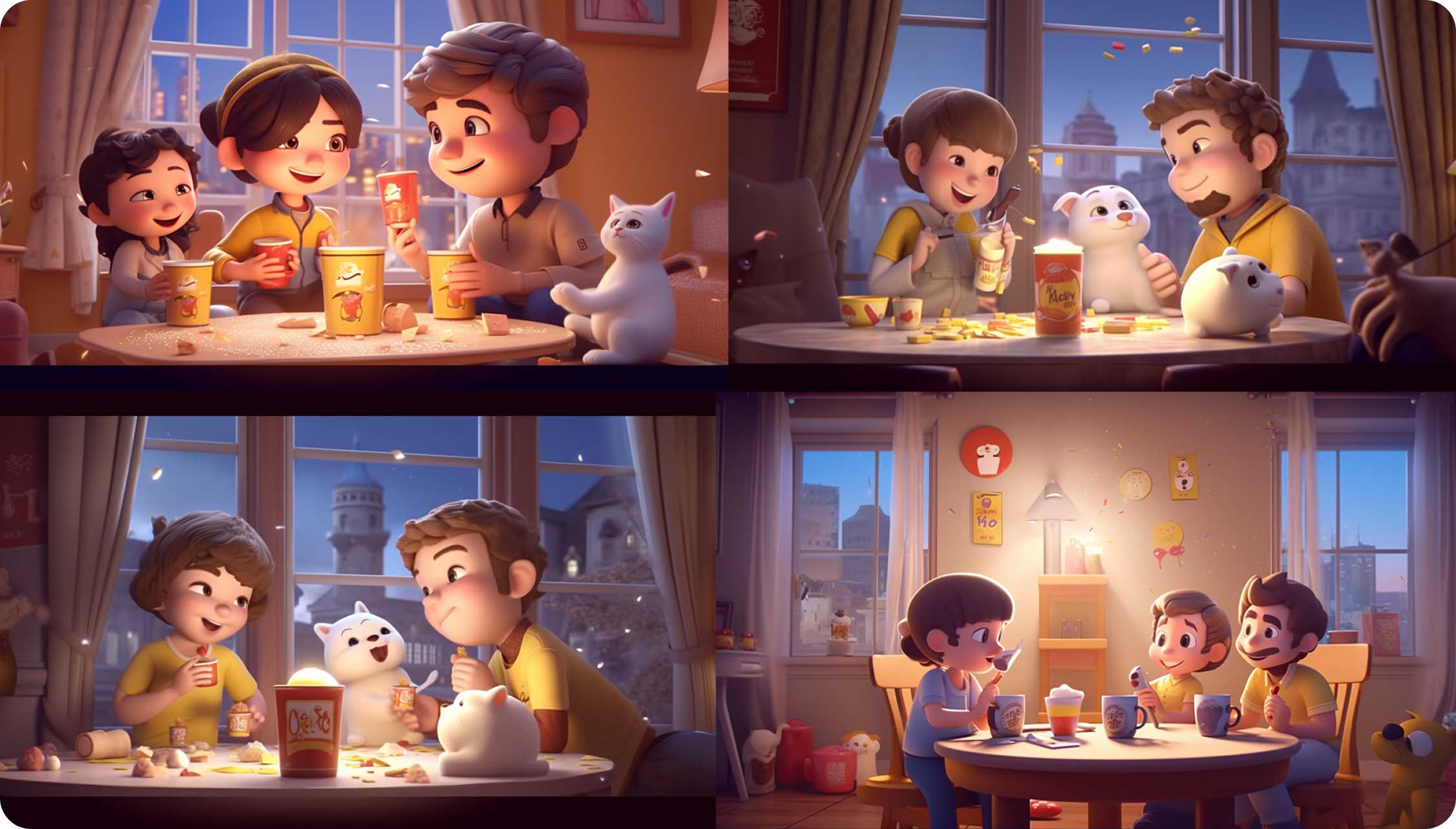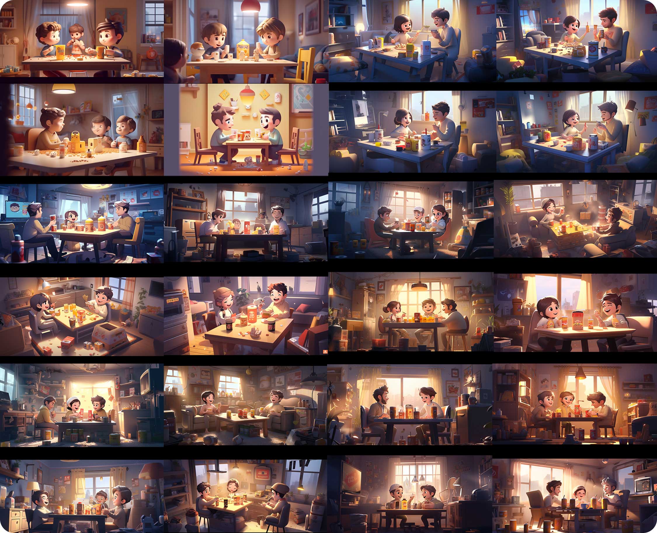 在前期,我們對(duì)構(gòu)想的畫面進(jìn)行關(guān)鍵詞的描述:“可愛帥氣的男女孩子們一起玩手機(jī),開心地微笑著,舉起手歡呼,溫暖的房間,大型落地窗。”將關(guān)鍵詞翻譯后放入Midjourney中進(jìn)行煉圖,最終篩選了幾張氛圍還不錯(cuò)的進(jìn)行下一步操作。