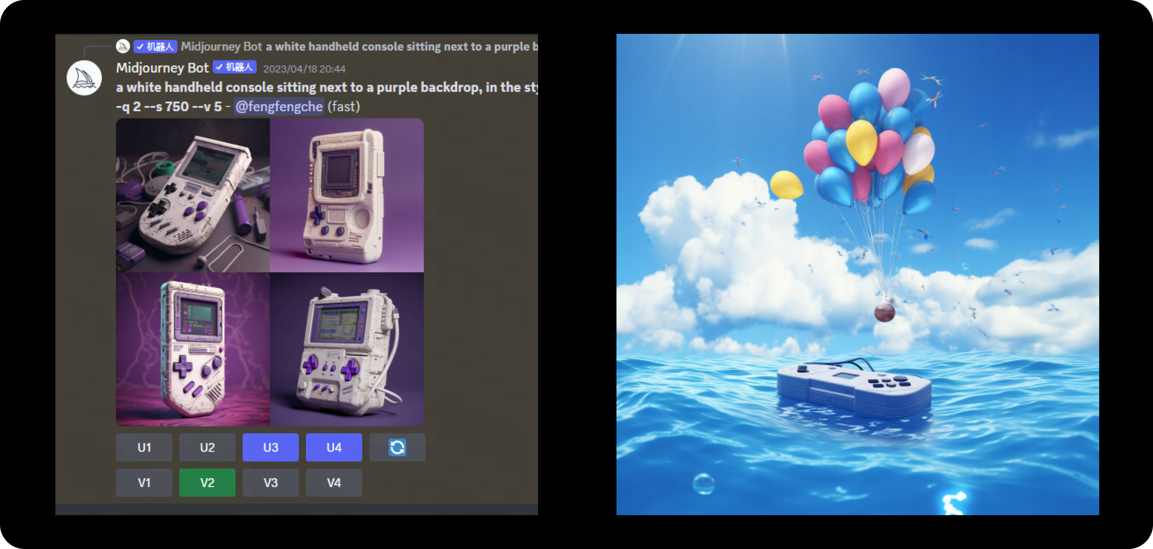 另外,一些零散的部件我們還是可以通過(guò)AI快速生成的。例如游戲機(jī)以及手柄,通過(guò)Midjourney就可以快速生成。