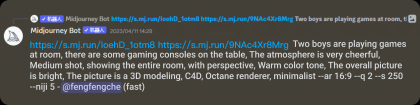 緊接著我們用之前篩選出來(lái)的其中一張或多張圖片,在Midjourney中進(jìn)行墊圖,根據(jù)之前所得結(jié)論對(duì)關(guān)鍵詞進(jìn)行優(yōu)化,再開始新的一輪煉圖。(關(guān)鍵詞增加了“中景”、“展示整個(gè)房間”、“透視感”、“畫面明亮”。)
