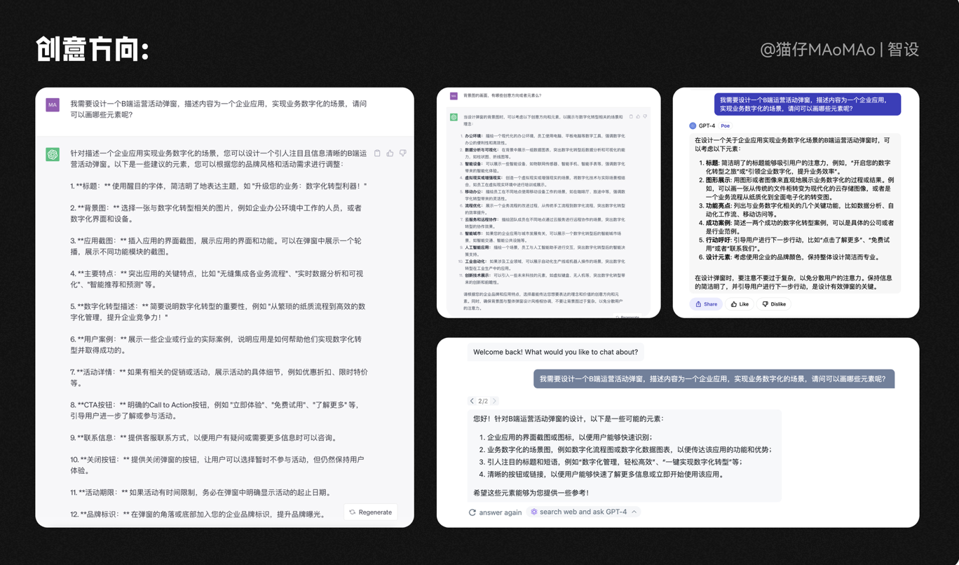 在沒有設(shè)計(jì)方向的時(shí)候,不妨讓AI大語言模型來幫助我們,它會根據(jù)需求的業(yè)務(wù)場景,給出合理的內(nèi)容建議,以及畫面元素的建議。
