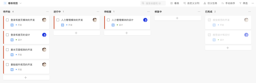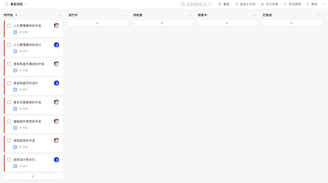 在看板工具中創(chuàng)建待開始、進行中、待檢查、修復中、已完成5個步驟,然后開始在待開始內創(chuàng)建相關的任務卡片。