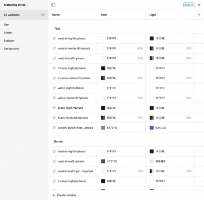 騰訊文檔顏色變量表 網上有很多關于如何使用軟件色彩樣式命名的方式來實現(xiàn) Token 應用的案例,但隨著 Figma 的 Variables 功能的上線,新的應用方式已經改寫。同時,Variables 可以實現(xiàn)除了色彩以外的更多屬性的更改,從而讓 Token 的應用范圍在設計軟件中進一步擴大(國產軟件跟上也勢在必行)。