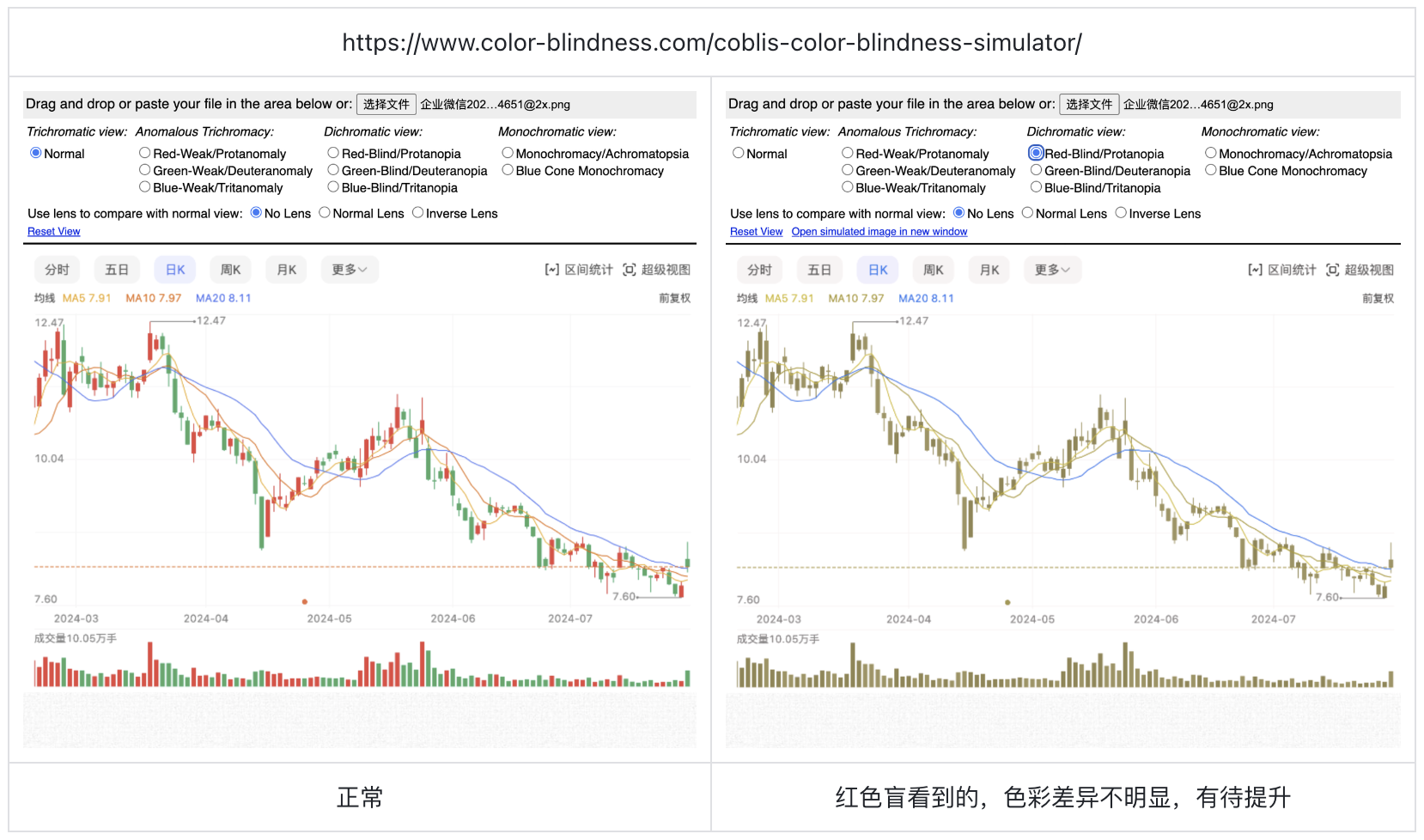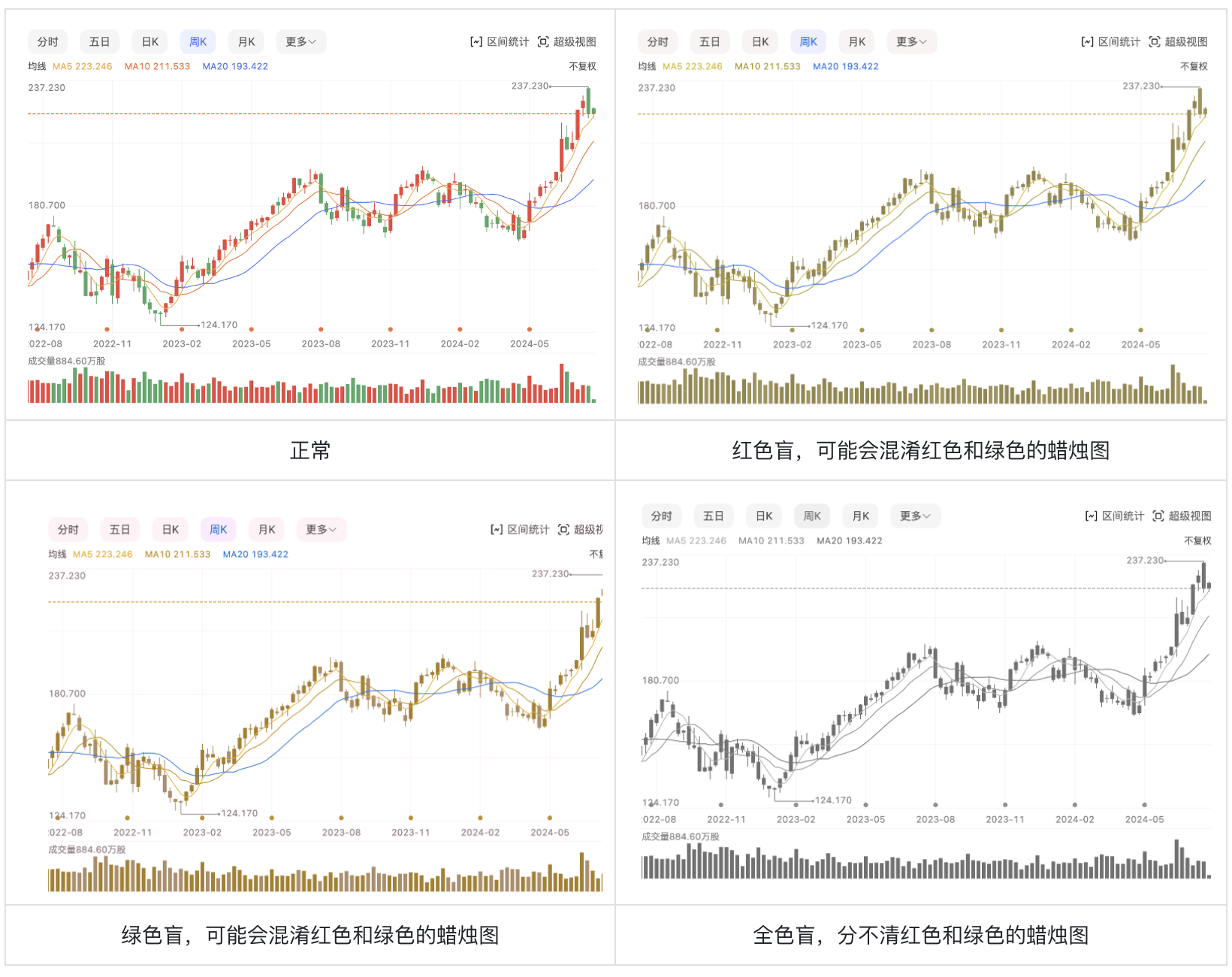 在股票市場中,顏色編碼是信息傳達的重要手段。許多分析工具使用紅色和綠色來表示虧損和盈利,這種直觀的視覺信號對大多數(shù)投資者十分有效。然而,色盲投資者在分析市場動態(tài)時,往往因無法準確分辨這些顏色而產(chǎn)生誤解,影響他們的決策能力。例如,紅綠色盲的投資者在分析股票個股時,可能會混淆紅色和綠色的蠟燭圖,導(dǎo)致錯誤的投資判斷。