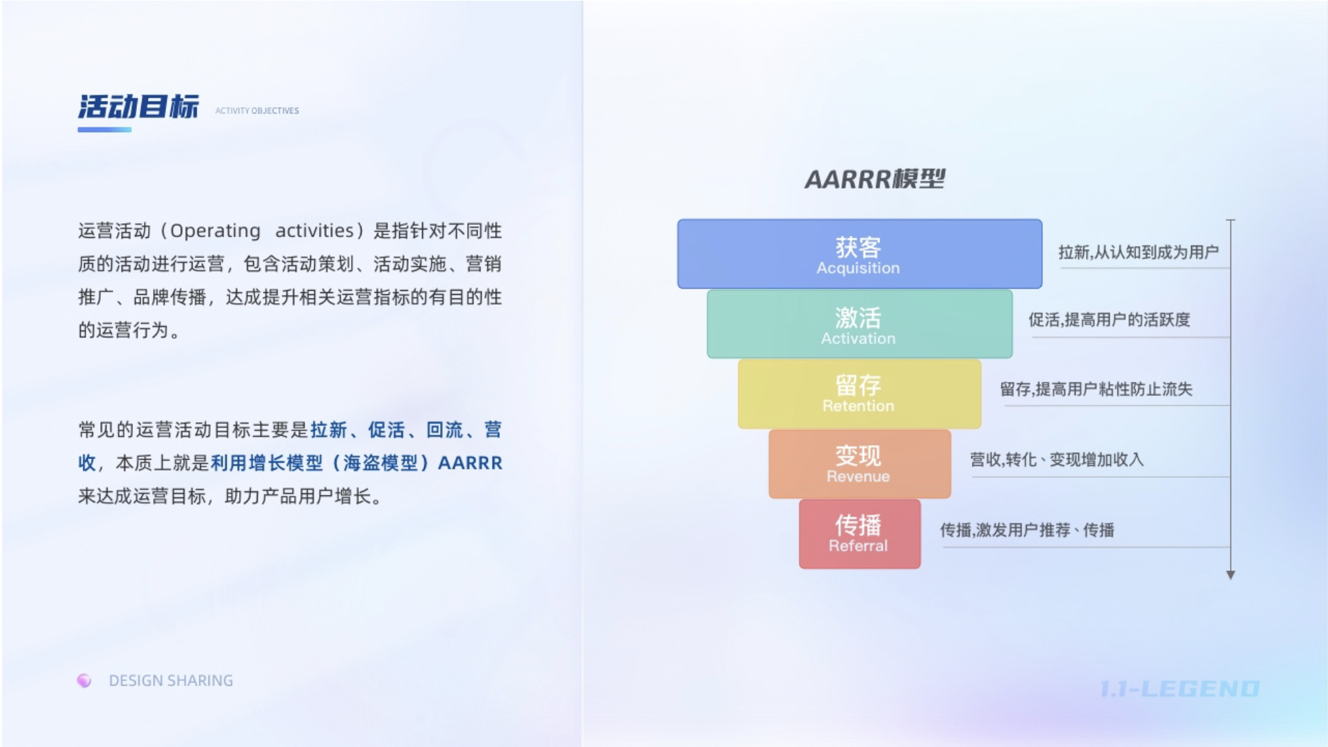 運營活動(Operating activities)是指針對不同性質(zhì)的活動進行運營,包含活動策劃、活動實施、營銷推廣、品牌傳播,達成提升相關(guān)運營指標(biāo)的有目的的運營行為。為了更好的達成既定目標(biāo),項目立項后我們需要了解此次運營活動的目標(biāo),以目標(biāo)展開設(shè)計策略和設(shè)計實施。常見的運營活動目標(biāo)主要是拉新、促活、回流、營收,本質(zhì)上就是利用增長模型AARRR來達成運營目標(biāo),助力產(chǎn)品用戶增長。