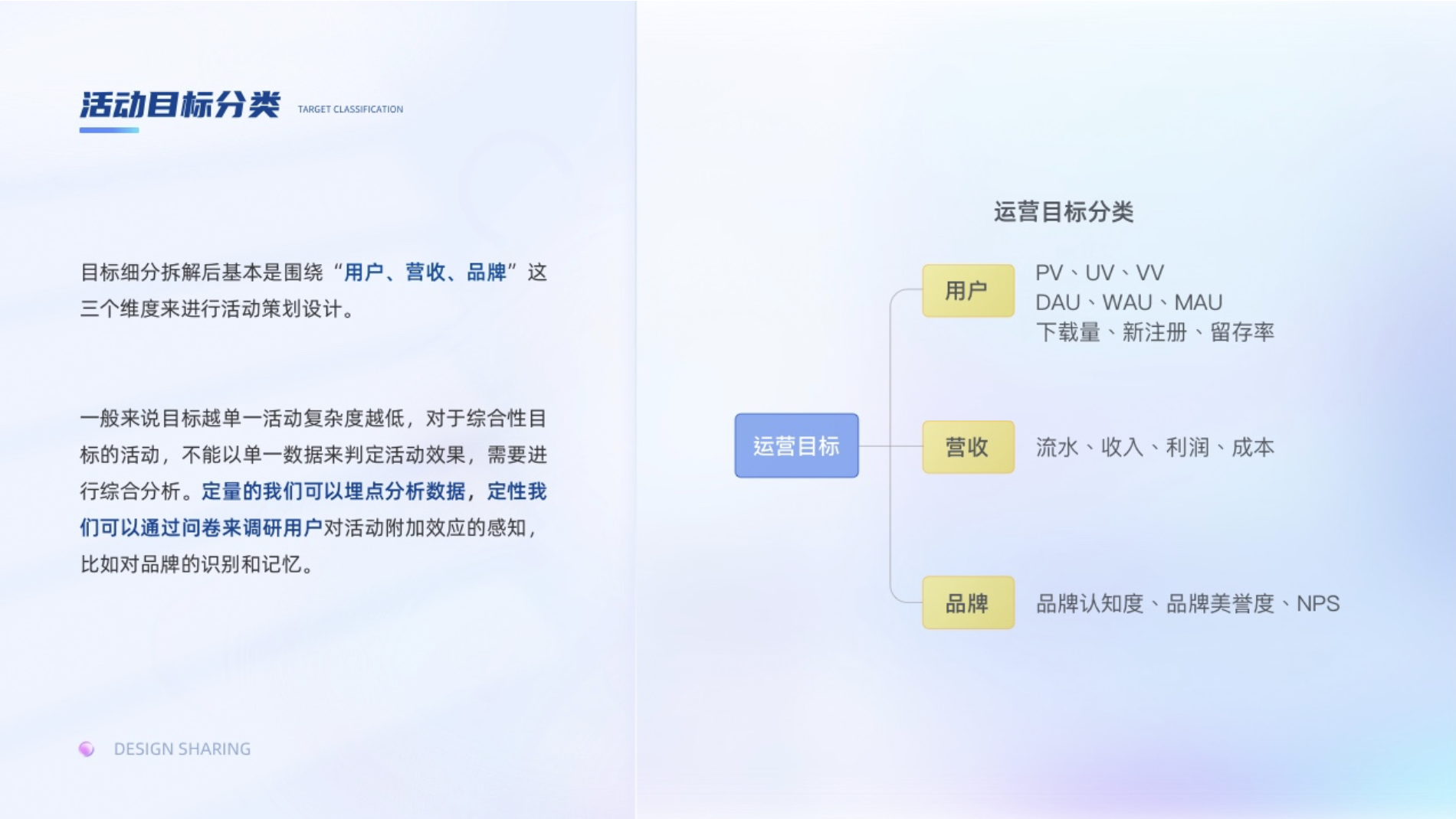 目標(biāo)的細(xì)分拆解后,基本都是圍繞“用戶、營收、品牌”這三個維度來進行活動策劃設(shè)計。一般來說目標(biāo)越單一活動復(fù)雜度越低,目標(biāo)綜合性越高,越需要調(diào)動不同類型用戶參與,活動的復(fù)雜度就越高。對于綜合性目標(biāo)的活動,不能以單一數(shù)據(jù)來判定活動效果,需要進行綜合分析。定量的我們可以埋點分析數(shù)據(jù),定性我們可以通過問卷來調(diào)研用戶對活動附加效應(yīng)的感知,比如對品牌的識別和記憶以及NPS(凈推薦值)。