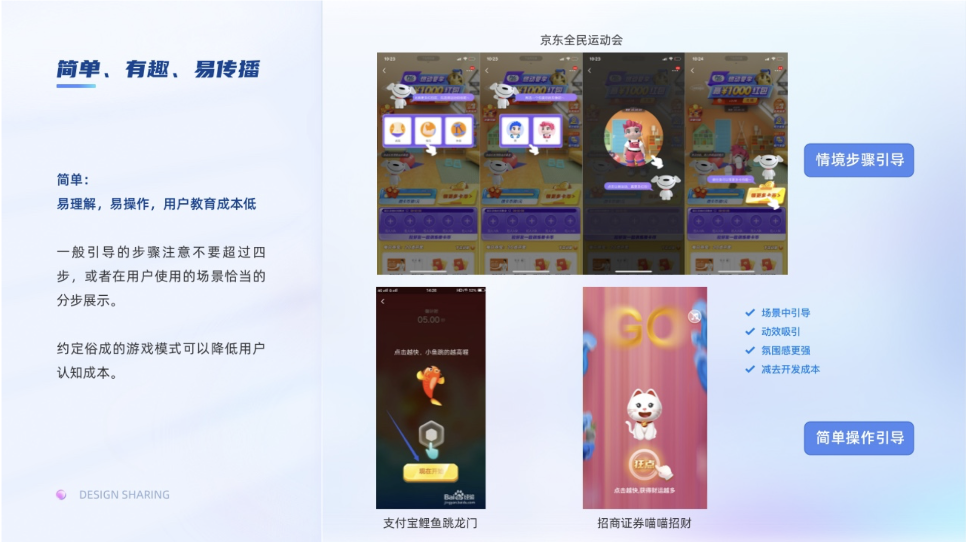簡單:是指用戶易理解,教育成本低,操作簡單。在運營設(shè)計中一般我們會與游戲結(jié)合,在此我稱為游戲運營。在游戲運營的設(shè)計中,如果不是一個約定俗成用戶都熟悉的游戲任務(wù),教育用戶如何操作的成本是相對較高的,需要有詳細(xì)的操作引導(dǎo)。一般引導(dǎo)的步驟注意不要超過四步,或者在用戶使用的場景恰當(dāng)?shù)姆植秸故?。比如鯉魚跳龍門游戲操作就比較簡單,引導(dǎo)只需要一個簡單的提示;而京東全民運動會作為大型活動比較復(fù)雜,引導(dǎo)步驟較多,對一步分用戶來說認(rèn)知成本高就不會參與活動。