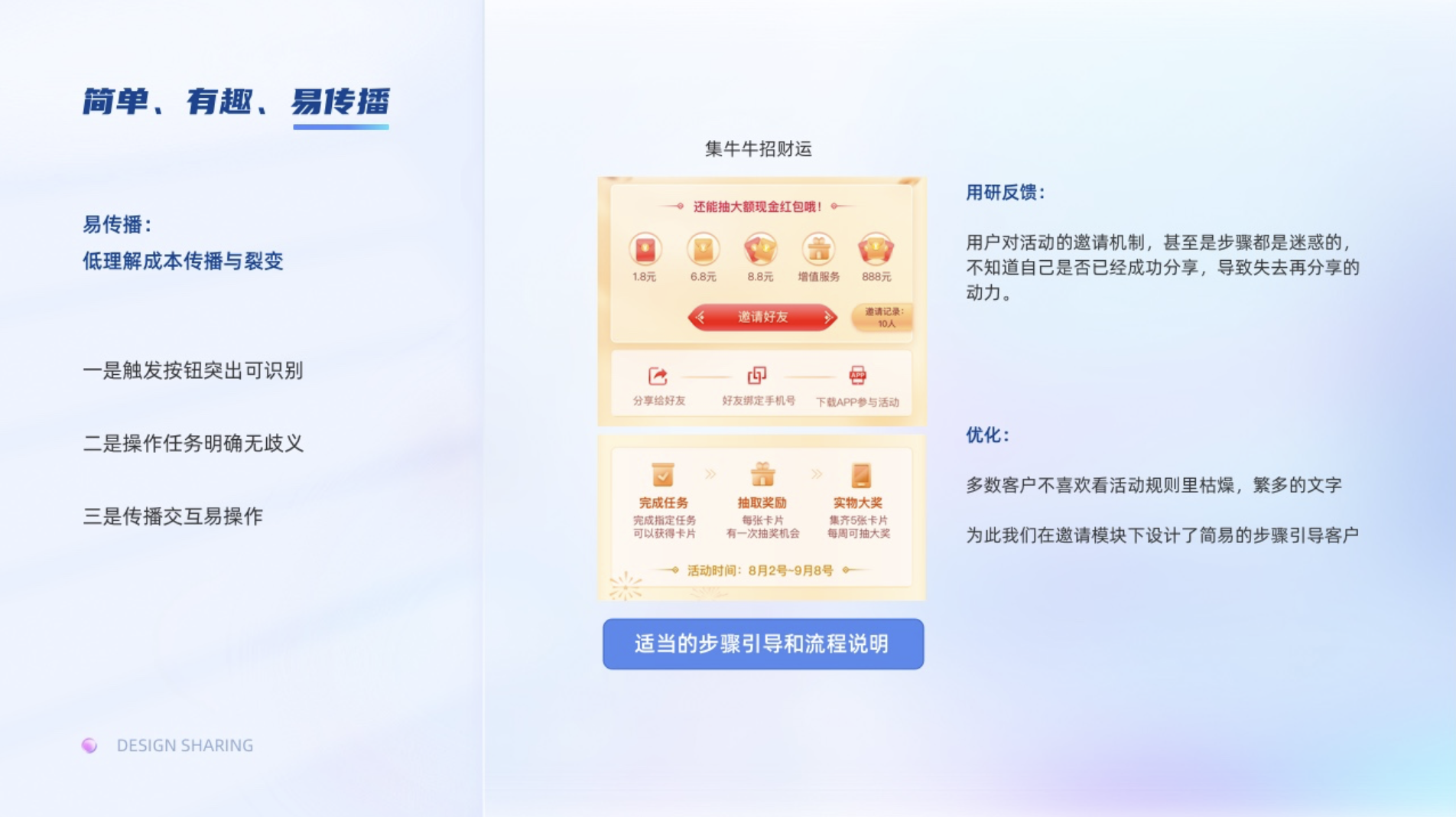 易傳播:是指低理解成本傳播與裂變。一是觸發(fā)按鈕突出可識別;二是操作任務(wù)明確無歧義;三是傳播交互易操作。通常我們設(shè)計的時候會理所當(dāng)然感覺用戶是很明確他們的操作行為的,但是基于某證券一期的活動用研反饋,用戶對活動的邀請機制,甚至是步驟都是迷惑的,不知道自己是否已經(jīng)成功分享,導(dǎo)致失去再分享的動力,為此我們在邀請模塊下設(shè)計了簡易的步驟去引導(dǎo)客戶。