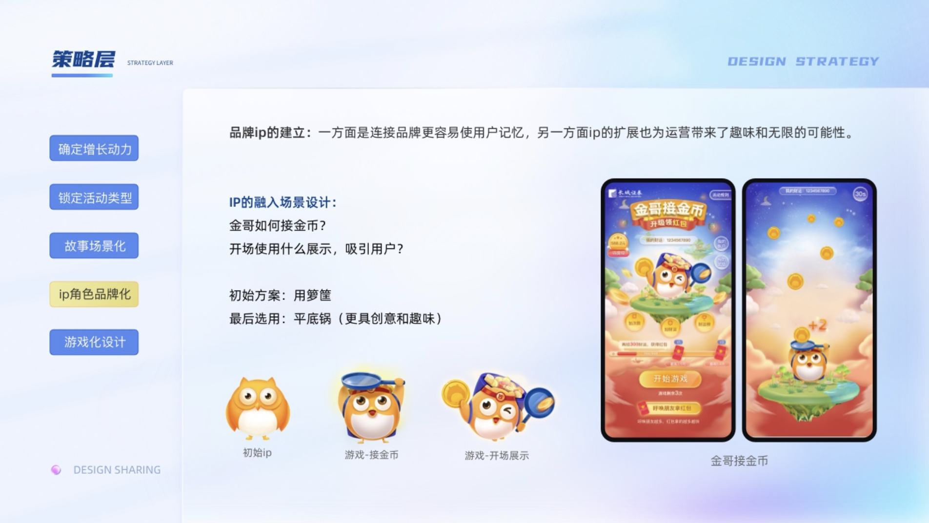 現(xiàn)在幾乎每個產(chǎn)品都有自己的ip,一方面是連接品牌更容易使用戶記憶,另一方面ip的擴展也為運營帶來了趣味和無限的可能性。ip的使用一是要保證ip的識別性,另一方便是需要很好的融入我們的故事場景。比如金哥他出現(xiàn)在我們接金幣的場景需要什么樣的裝束,使用什么動作更好的連接到這個接金幣的故事場景中。一開始想著用籮筐去接金幣,但是籮筐體積大而高,會擋住ip,降低了ip的識別度。在設(shè)計的過程中突然靈光一閃,為了什么不用平底鍋呢,它除了打人,接金幣也不錯。通過金哥頭頂平底鍋的接金幣方式,增添了整個游戲的創(chuàng)新性和趣味性,至于籮筐可以收納平底鍋接到的金幣,整個場景就很有邏輯性和畫面感了。同時為了凸顯游戲的氛圍,還給ip設(shè)計了頭帶必勝的綁帶的小細(xì)節(jié),和有沖擊力的動作,增添了ip的生命力。