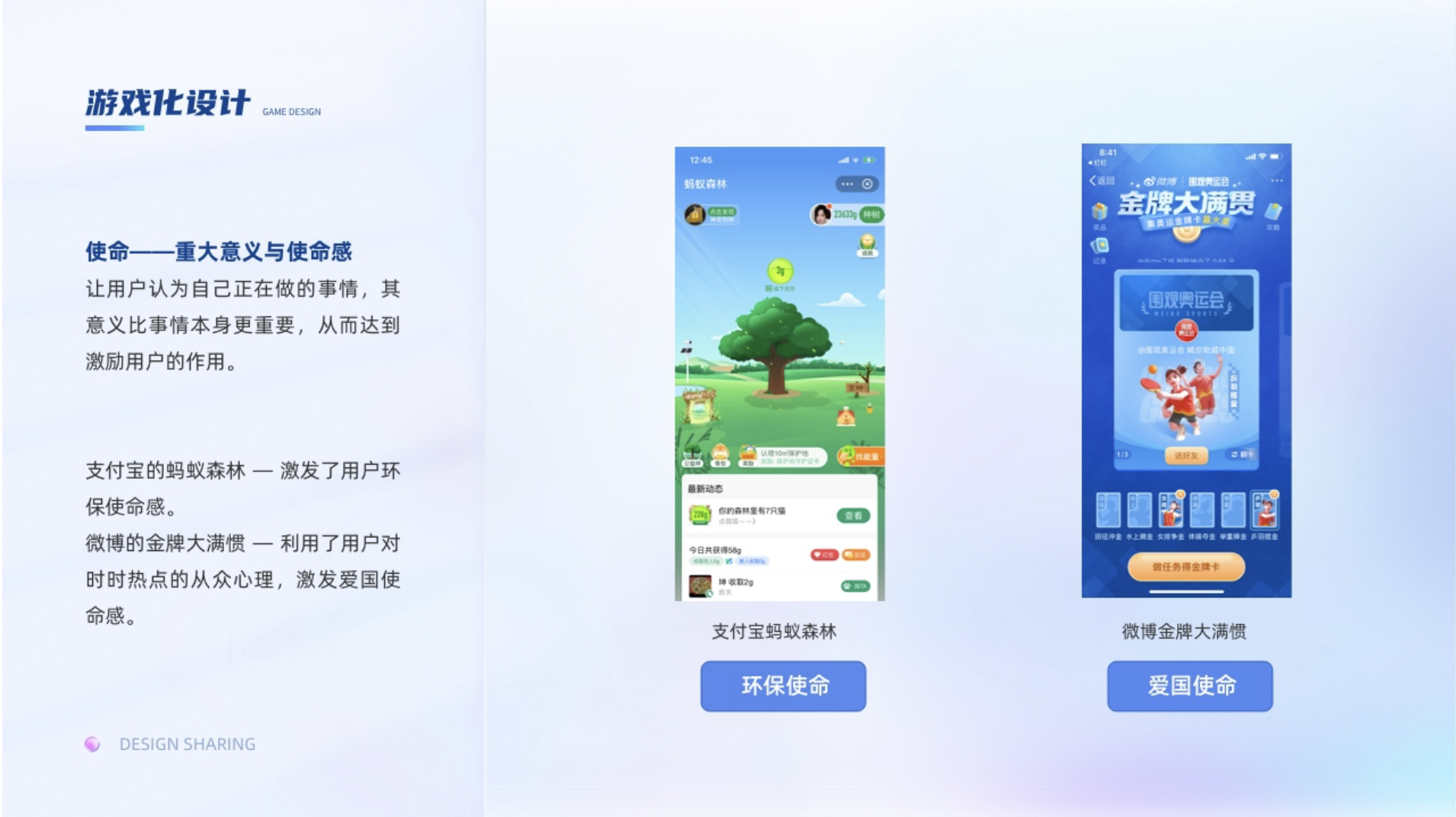 讓用戶認(rèn)為自己正在做的事情,其意義比事情本身更重要,從而達到激勵用戶的作用。譬如支付寶里面的螞蟻森林,種的不是樹,而是地球的一點綠,這個使命感瞬間油然而生,在玩的過程中還能幫助地球綠化,激發(fā)了用戶環(huán)保使命感。再比如在奧運期間的微博的金牌大滿慣的活動,以圍觀奧運會之名,集奧運金牌卡喊你助威中國,利用了用戶對時時熱點的從眾心理,又聯(lián)系到了愛國上升了到了愛國使命感。
