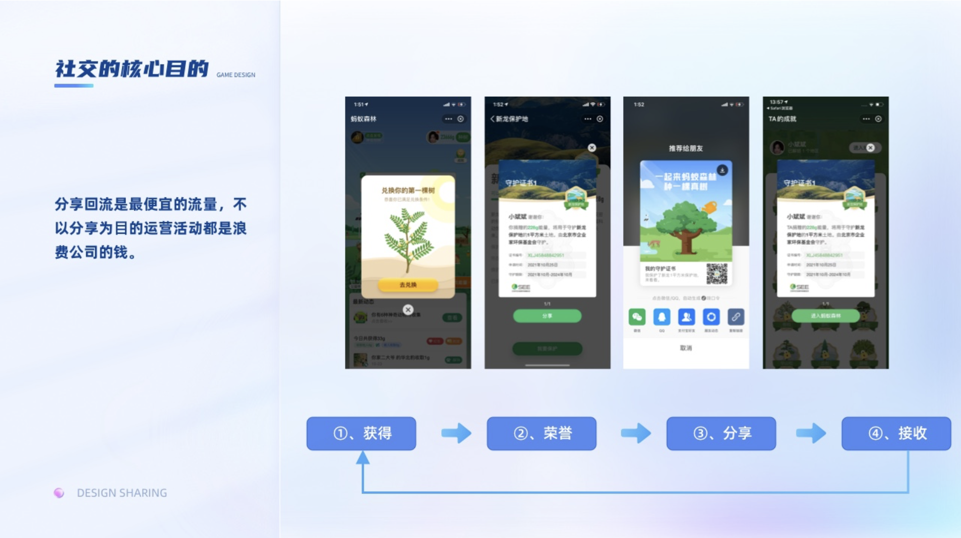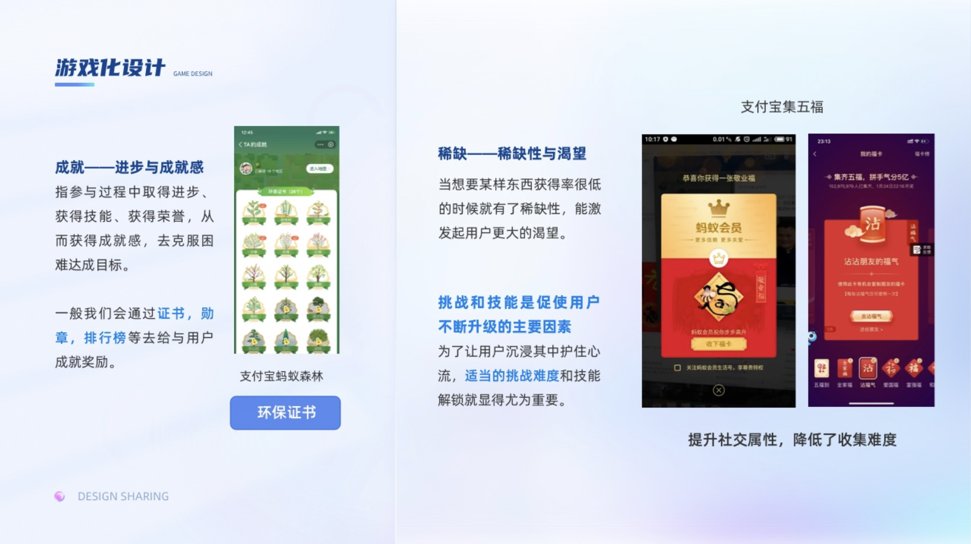 指參與過程中取得進步、獲得技能、獲得榮譽,從而獲得成就感,去克服困難達成目標(biāo)。一般我們會通過證書,勛章,排行榜等去給與用戶成就獎勵。挑戰(zhàn)和技能是促使用戶不斷升級的主要因素,為了讓用戶沉浸其中護住心流,適當(dāng)?shù)奶魬?zhàn)難度和技能解鎖就顯得尤為重要。挑戰(zhàn)難度高了容易引起用戶的焦慮,難度低了又會讓用戶感覺無聊。比如集卡行動,在考慮總預(yù)算不變的情況下,如何設(shè)置稀有卡的比例,集卡的難度就尤為重要。支付寶集五福在初期,敬業(yè)福的比例比較低,所以用戶抽到敬業(yè)福的體驗就很開心,但隨著支付寶后面為了擴大社交屬性,提高了集齊率,集五到五福的興奮感就弱了,導(dǎo)致部分用戶失去動力,因為集到的人越多后續(xù)瓜分的錢就越少。
