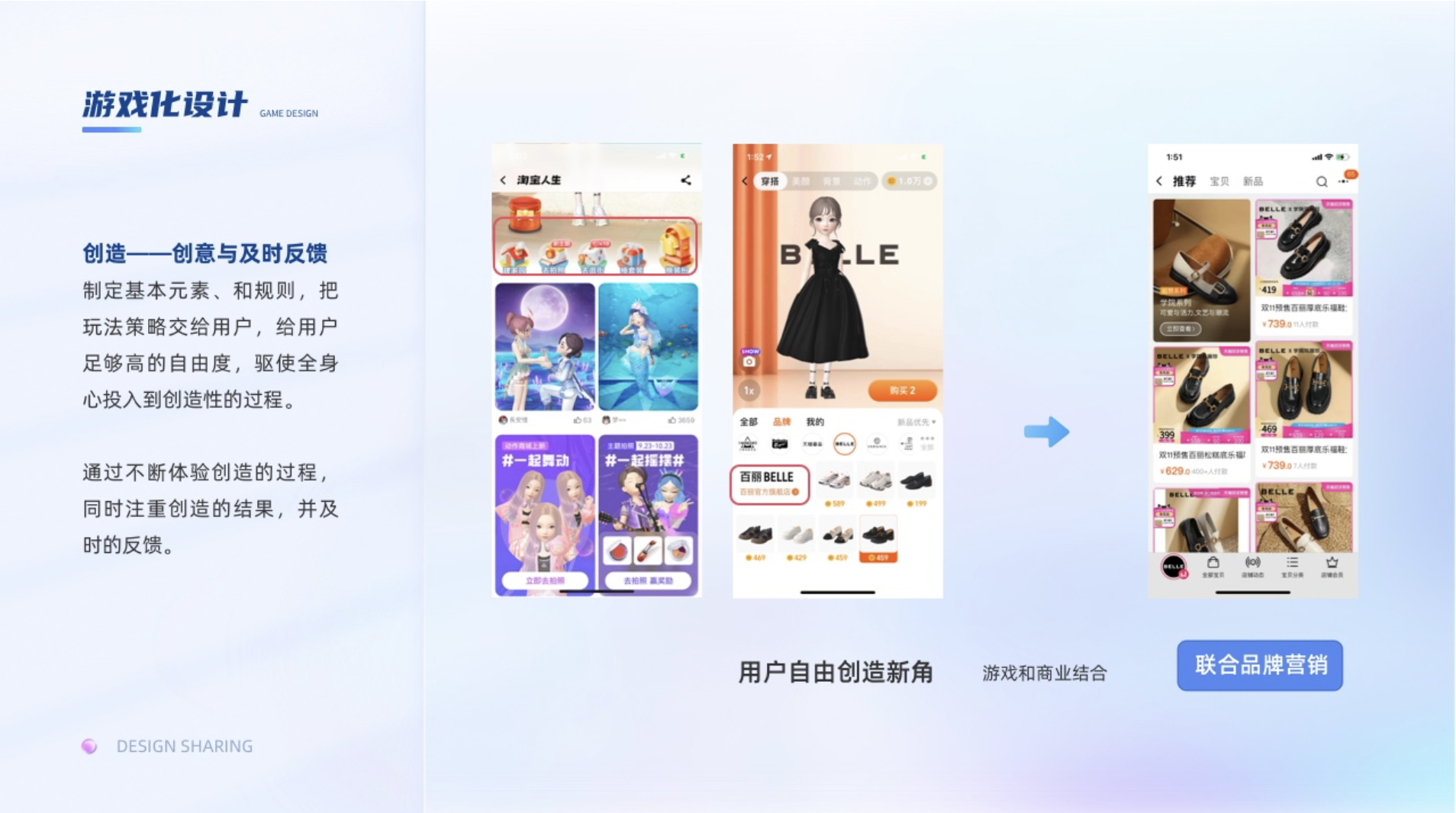 制定基本元素、和規(guī)則,把玩法策略交給用戶,給用戶足夠高的自由度,驅(qū)使全身心投入到創(chuàng)造性的過程。通過不斷體驗創(chuàng)造的過程,同時注重創(chuàng)造的結(jié)果,并及時的反饋。比如淘寶人生,可以打造自己的形實質(zhì)上就是裝扮類的游戲,這種常駐型的游戲,不僅可以提高用戶使用產(chǎn)品的時長,還可以聯(lián)動品牌做營銷提高下單率。其生命力的不竭動力就源于,對用戶不斷提供創(chuàng)新的服裝、妝容、飾品、場景,讓用戶自由創(chuàng)造新角。