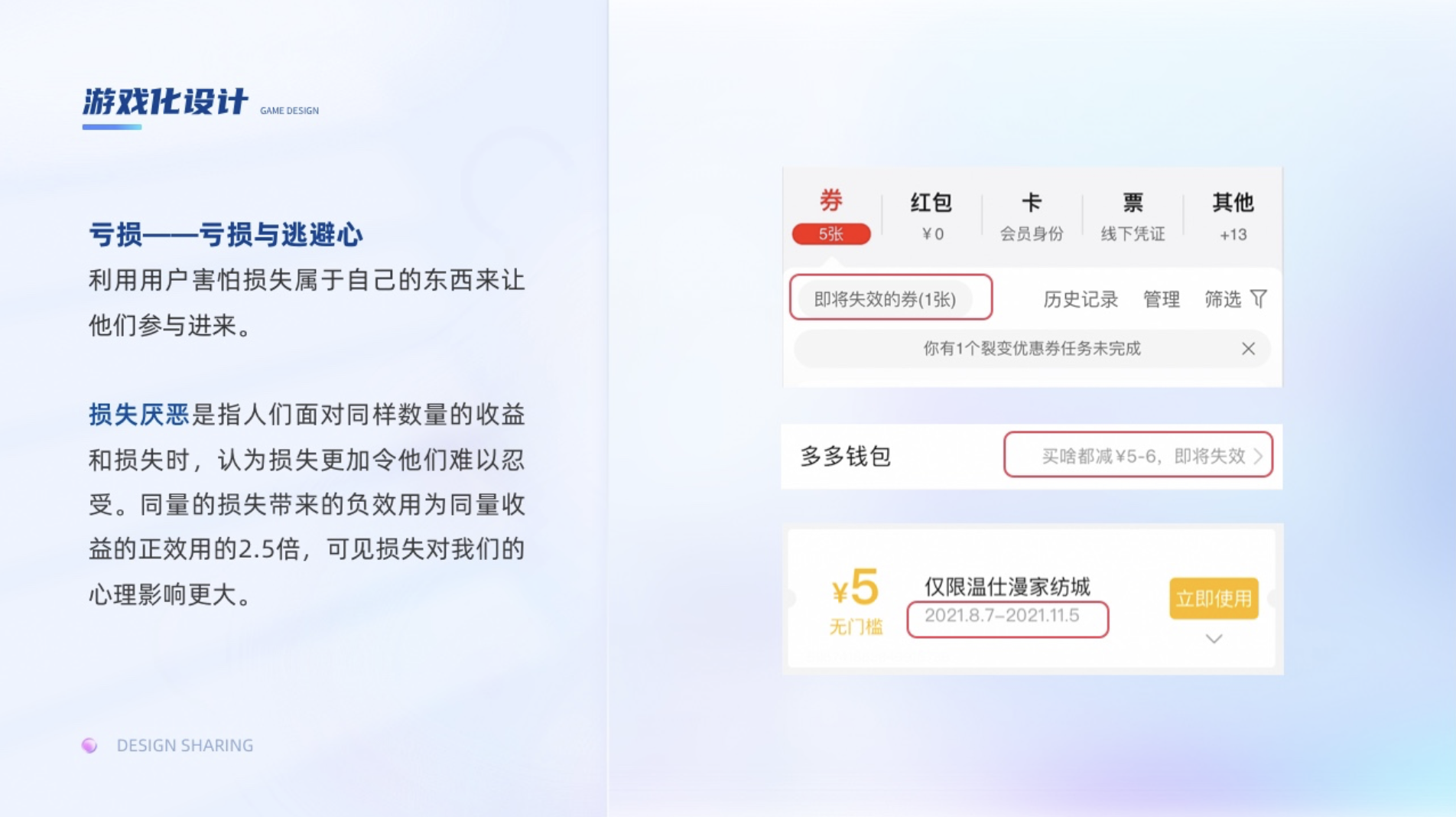 利用用戶害怕?lián)p失屬于自己的東西來讓他們參與進來??梢越Y(jié)合損失厭惡來理解。損失厭惡是指人們面對同樣數(shù)量的收益和損失時,認(rèn)為損失更加令他們難以忍受。同量的損失帶來的負(fù)效用為同量收益的正效用的2.5倍,可見損失對我們的心理影響更大。比如商家發(fā)給你的免費優(yōu)惠券,其實你本身不需要購買什么,但是商家偏偏在優(yōu)惠券上加上時效性,超過活動日期就置灰了,即使你原本沒有購買需求,但是感覺沒用掉優(yōu)惠券就像損失了優(yōu)惠券的錢一樣,就會去購買,甚至為了湊單購買更多東西。