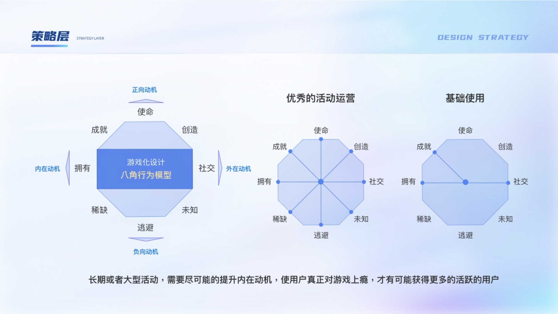 由于游戲本身對用戶就有一種天然的吸引力,加上可以很好的與運營活動結(jié)合打造沉浸式體驗,越來越多活動都是與游戲結(jié)合來達到活動目標(biāo),也叫運營的游戲化。核心宗旨是“以人為本”的設(shè)計理念,并不是以功能為中心,在設(shè)計時可以使用游戲化設(shè)計八角模型。