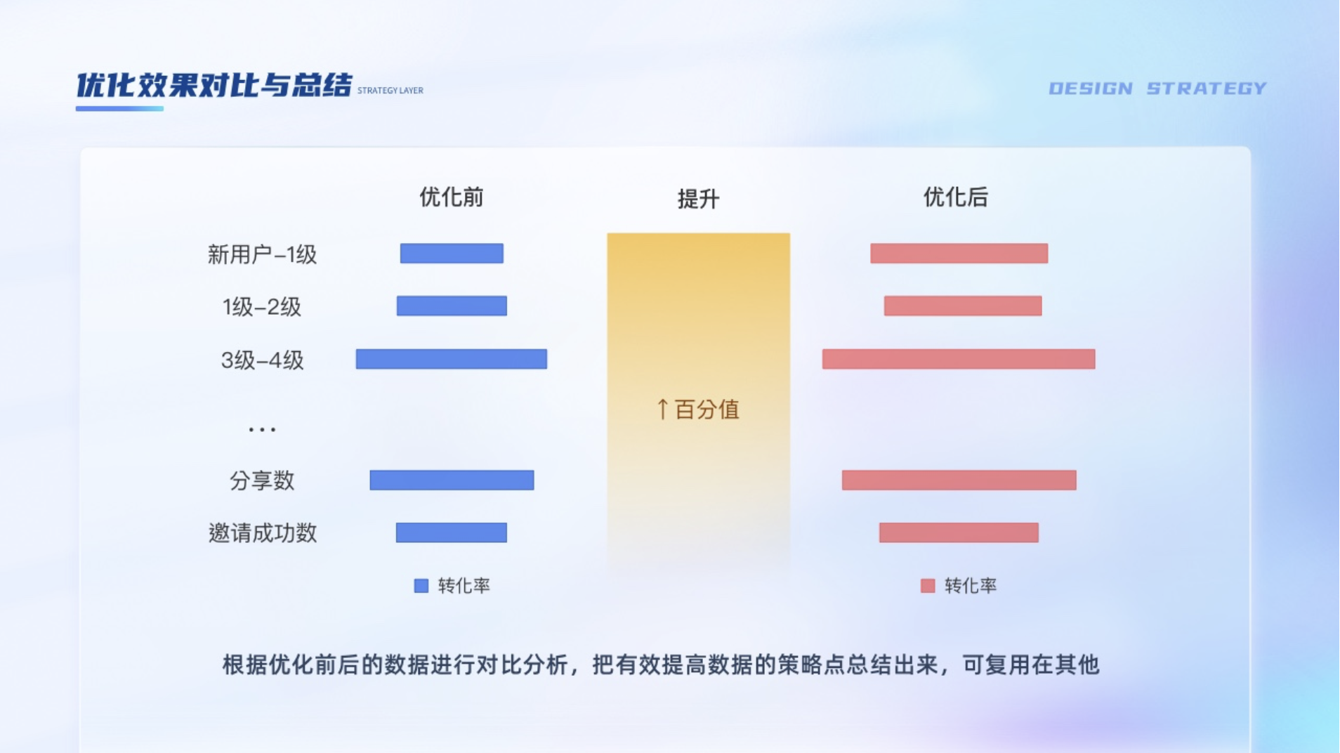 根據(jù)優(yōu)化前后的數(shù)據(jù)進行對比分析,把有效提高數(shù)據(jù)的策略點總結(jié)出來,可復(fù)用在其他項目。