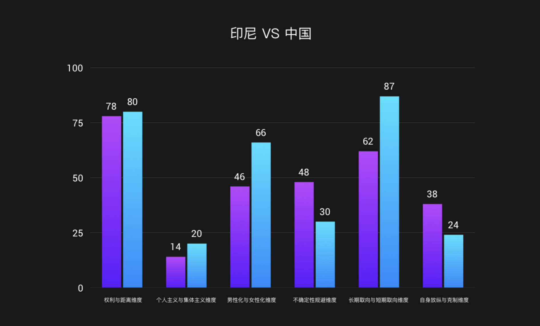 首先建立文化場景,如上圖所示,主體國家是印尼,對(duì)比國家是中國。對(duì)印尼和中國的群體進(jìn)行文化維度分析。