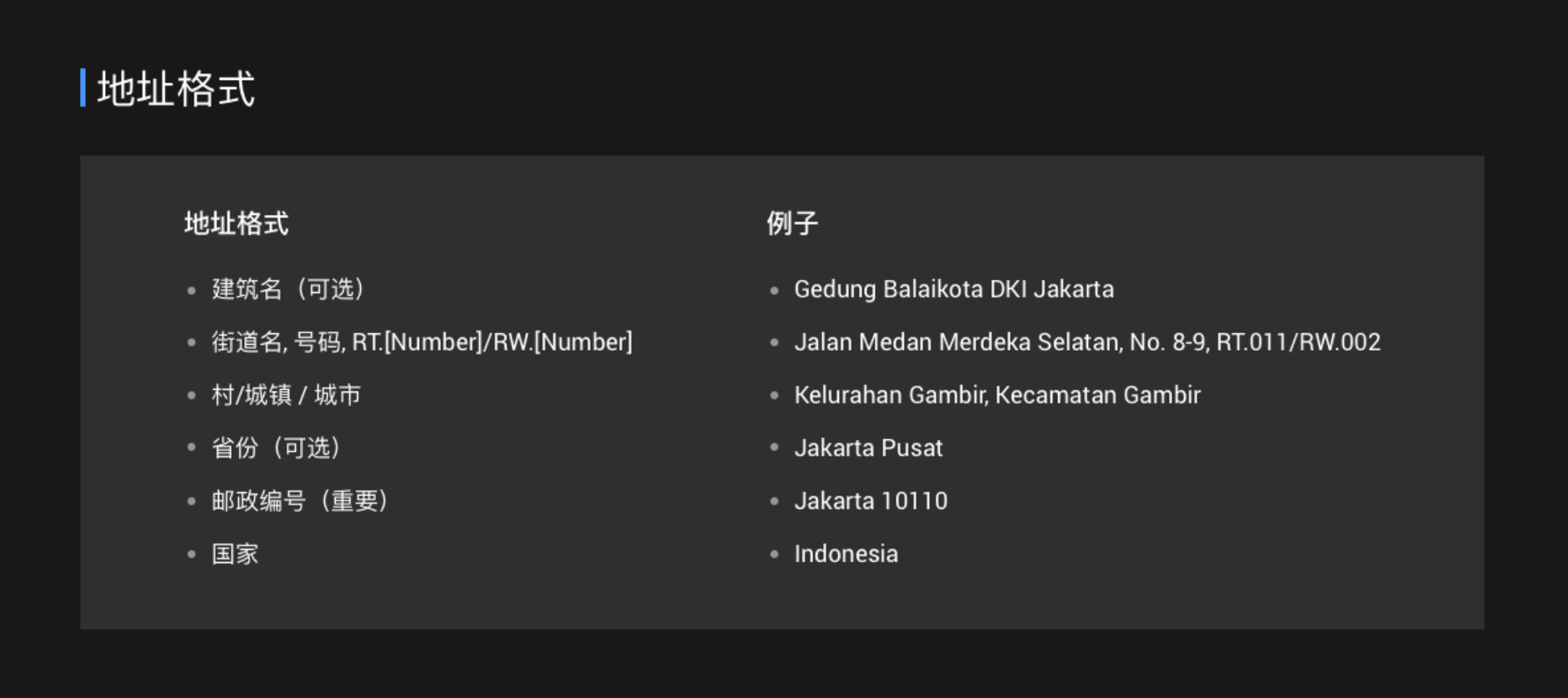 中國的地址格式是:從大到小,從國家再到街道。而印尼的地址格式和西方的寫法一樣,從小到大。