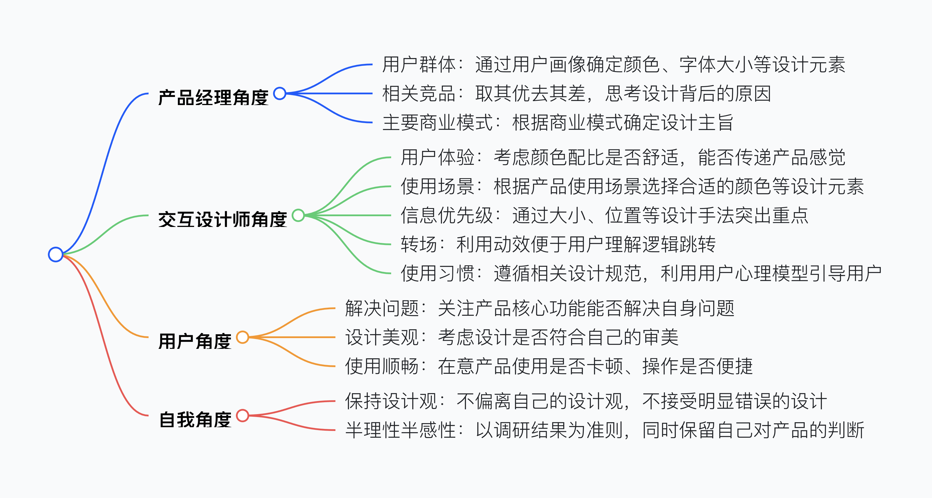 UI 設(shè)計(jì)需從產(chǎn)品經(jīng)理、交互設(shè)計(jì)師、用戶和自我這 4 個(gè)角度思考:像產(chǎn)品經(jīng)理一樣關(guān)注用戶群體、相關(guān)競品、主要商業(yè)模式;像交互設(shè)計(jì)師一樣考慮用戶體驗(yàn)、使用場景、信息優(yōu)先級、轉(zhuǎn)場、使用習(xí)慣;像用戶一樣思考產(chǎn)品能否解決問題、設(shè)計(jì)是否美觀、使用是否順暢;像自己一樣保持設(shè)計(jì)觀,不盲目接受錯(cuò)誤設(shè)計(jì)。如此才能做出符合用戶需求且有自己韻味的設(shè)計(jì)。