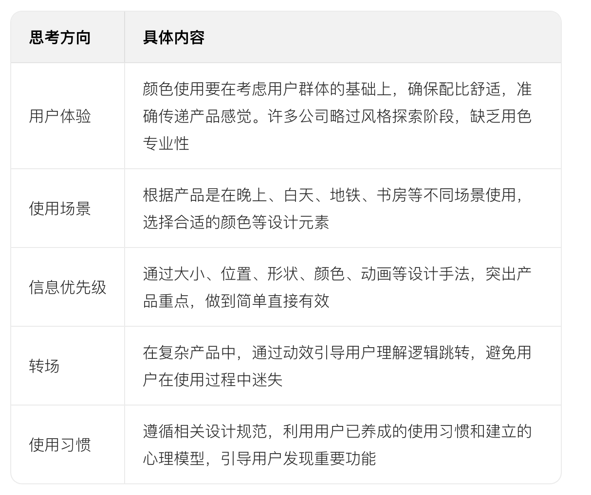 - 答案:交互設(shè)計(jì)師角度的思考包括用戶體驗(yàn)、使用場景、信息優(yōu)先級、轉(zhuǎn)場、使用習(xí)慣等方面。在用戶體驗(yàn)上,影響顏色配比的舒適性和對產(chǎn)品感覺的傳遞;在使用場景上,決定設(shè)計(jì)元素是否符合產(chǎn)品使用環(huán)境;在信息優(yōu)先級上,指導(dǎo)如何通過設(shè)計(jì)手法突出重點(diǎn);在轉(zhuǎn)場上,幫助用戶理解邏輯跳轉(zhuǎn);在使用習(xí)慣上,利用用戶心理模型引導(dǎo)操作,這些都能提升 UI 設(shè)計(jì)的實(shí)用性和用戶體驗(yàn)。