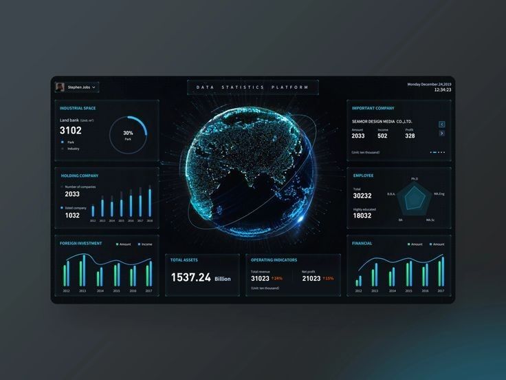 企業(yè)數(shù)據(jù)往往枯燥且復(fù)雜,而這類設(shè)計(jì)卻讓數(shù)據(jù) “活” 了起來。深色背景與熒光色、科技藍(lán)的碰撞,既拉滿科技氛圍,又通過色彩區(qū)分?jǐn)?shù)據(jù)維度,讓層級一目了然。環(huán)形圖、折線圖等可視化組件,把營收、用戶增長等數(shù)據(jù)動(dòng)態(tài)展示,仿佛數(shù)據(jù)在 “講述” 企業(yè)故事。這讓我們思考:數(shù)據(jù)類 UI 不該只是 “數(shù)據(jù)的容器”,更應(yīng)是 “數(shù)據(jù)的翻譯官”,蘭亭妙微在做類似設(shè)計(jì)時(shí),也會(huì)努力讓專業(yè)數(shù)據(jù)變得更易感知、更能輔助決策。