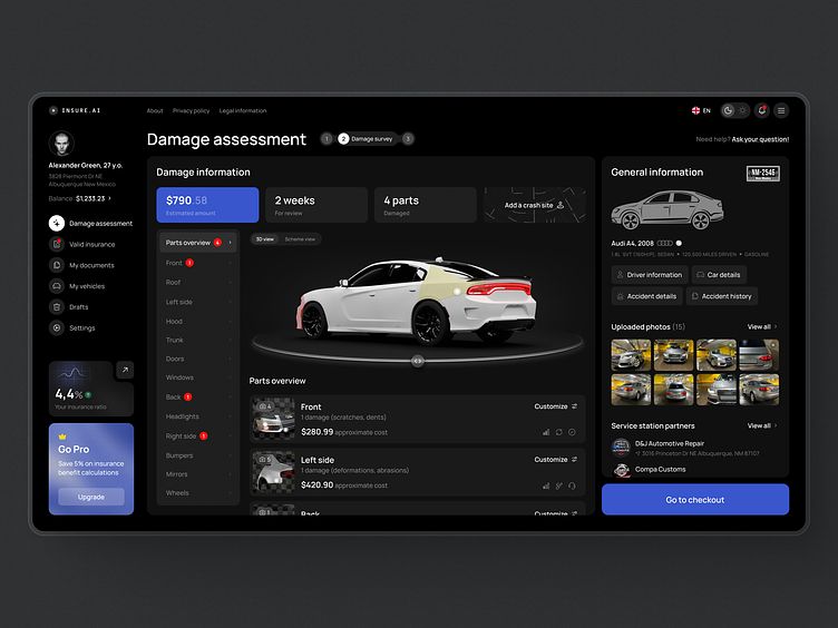 汽車定損專業(yè)性強(qiáng),UI 既要體現(xiàn)嚴(yán)謹(jǐn),又要降低用戶理解門檻。設(shè)計(jì)中,汽車 3D 模型可交互查看,受損部位色彩標(biāo)注清晰,定損金額、維修時(shí)長等信息一目了然。深色界面搭配藍(lán)色操作按鈕,既符合專業(yè)場景調(diào)性,又通過色彩引導(dǎo)操作流程。這給我們的啟發(fā)是:專業(yè)場景的 UI,不是要 “拒人千里”,而是要通過設(shè)計(jì),把專業(yè)內(nèi)容 “友好地” 呈現(xiàn)給用戶,蘭亭妙微在這類項(xiàng)目中,也會(huì)深入調(diào)研業(yè)務(wù)流程,讓設(shè)計(jì)為 “專業(yè)” 賦能,而非添堵。