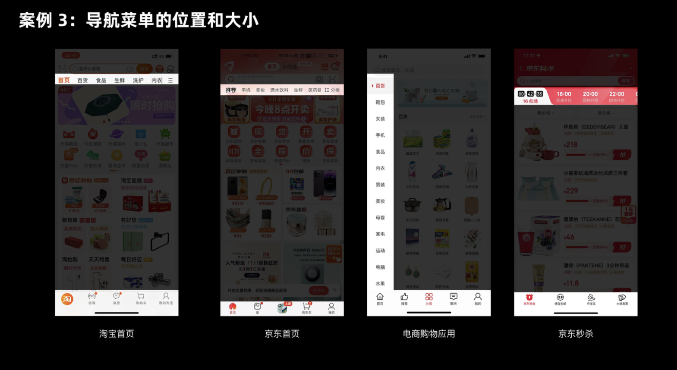 導航是用戶高頻操作的模塊,它的位置和大小直接影響瀏覽效率。菲茲定律在這里的應用重點是 “縮短距離”—— 把導航放在用戶手指或視線最容易到達的地方。