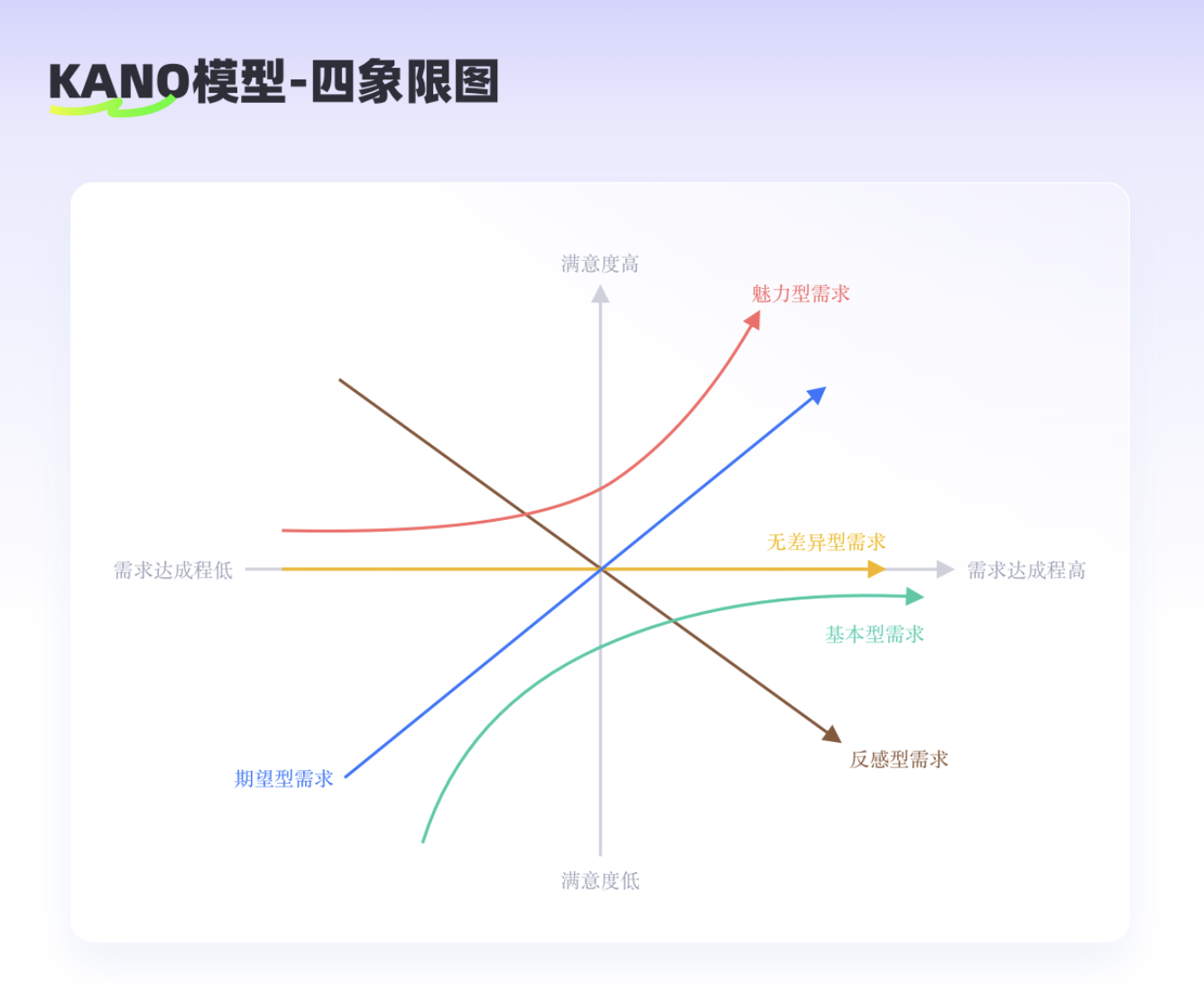 想做好愉悅感設(shè)計,首先要明白:不是所有功能都能帶來愉悅,只有找對 “用戶真正在意的需求”,才能避免 “費(fèi)力不討好”。東京理工大學(xué)狩野紀(jì)昭教授提出的 Kano 模型,能幫我們理清需求的優(yōu)先級,找到愉悅感的發(fā)力點(diǎn)。