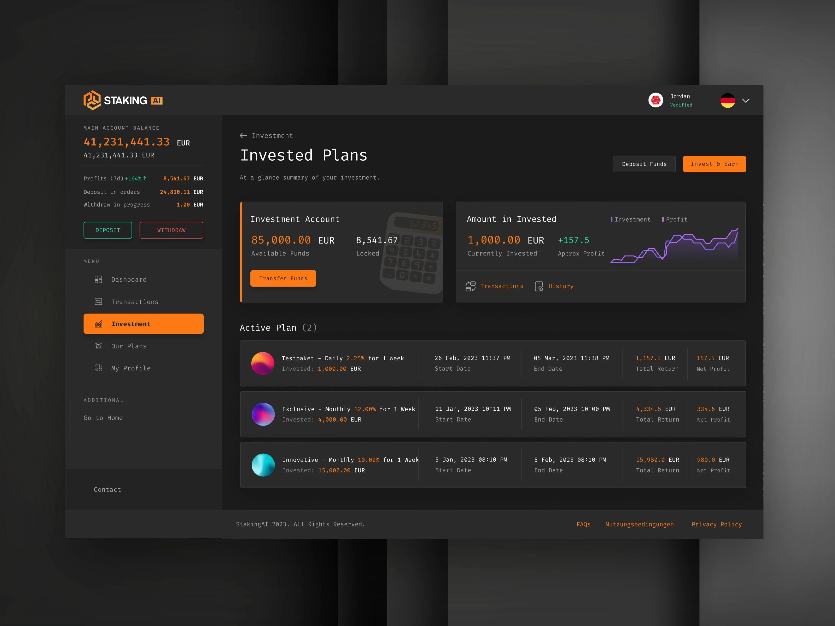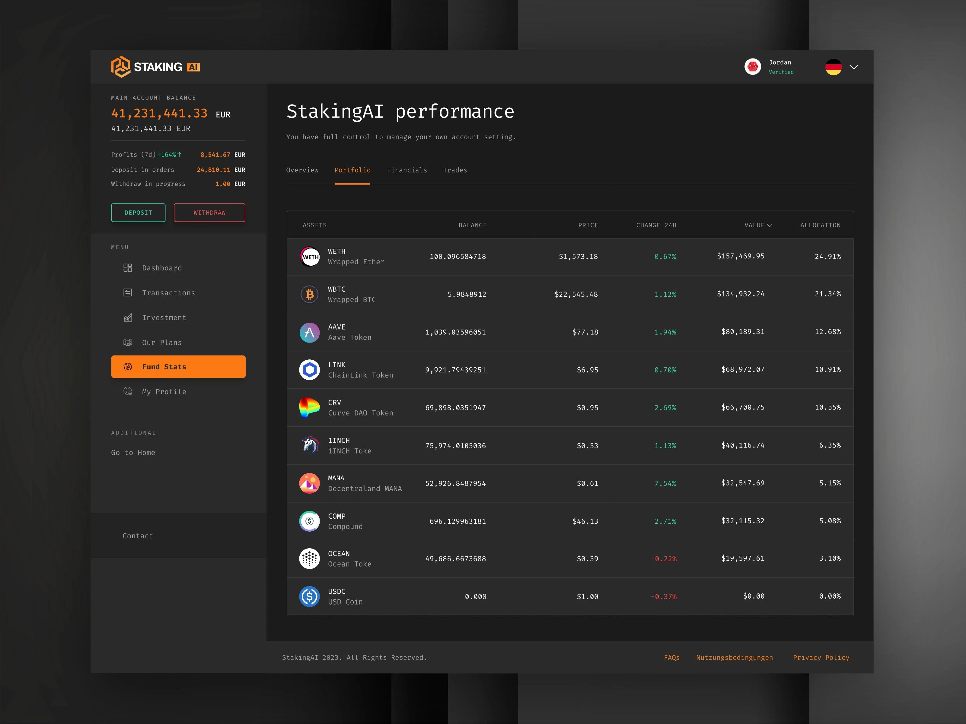 行業(yè)適配性:這種設計高度契合加密貨幣、金融投資類平臺的屬性,既通過深色風格傳遞 “穩(wěn)重、可信” 的品牌形象,又以精準的數據可視化和清晰的操作路徑,滿足投資者對 “資產透明化、操作便捷化” 的核心需求,是金融科技領域界面設計的優(yōu)質范例。