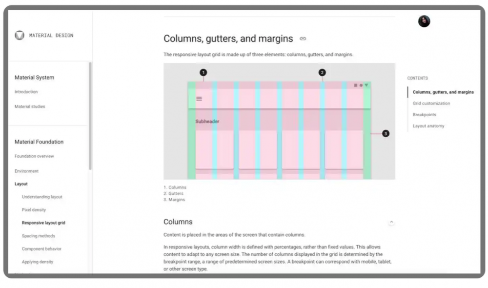 Material Design的柵格布局是一種響應(yīng)式設(shè)計(jì)系統(tǒng),旨在確保用戶界面在不同設(shè)備和屏幕尺寸上的一致性和靈活性。它主要基于12列的柵格系統(tǒng),允許設(shè)計(jì)師和開(kāi)發(fā)者在布局中有效地組織內(nèi)容。
