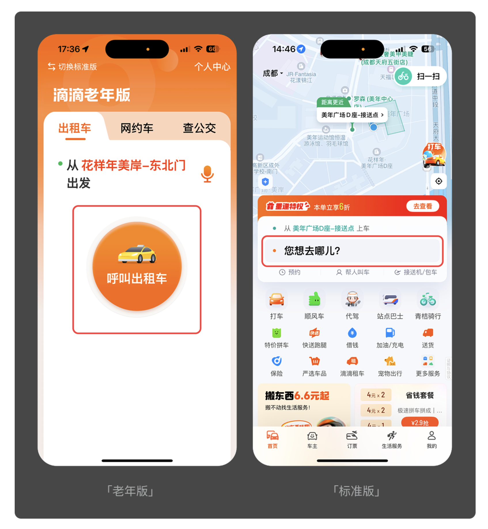 清晰的界面是老人順利操作的基礎(chǔ)。老年用戶的視覺敏感度下降,過小的字體、密集的圖標(biāo)、復(fù)雜的排版都會給他們帶來困擾。滴滴老年版將主要功能模塊以大字體、高對比度的圖標(biāo)形式呈現(xiàn),摒棄了標(biāo)準(zhǔn)版中繁雜的附加服務(wù)入口,讓 “打車” 這一核心功能一目了然;淘寶老年版則聚焦老人常用的 “購物、訂單、客服” 功能,隱藏了百億補貼、直播帶貨等復(fù)雜板塊,用簡潔的布局和醒目的文字,降低了視覺識別成本。好的適老化界面設(shè)計,就像給產(chǎn)品 “畫重點”,讓老人無需費力尋找,就能快速定位所需功能。