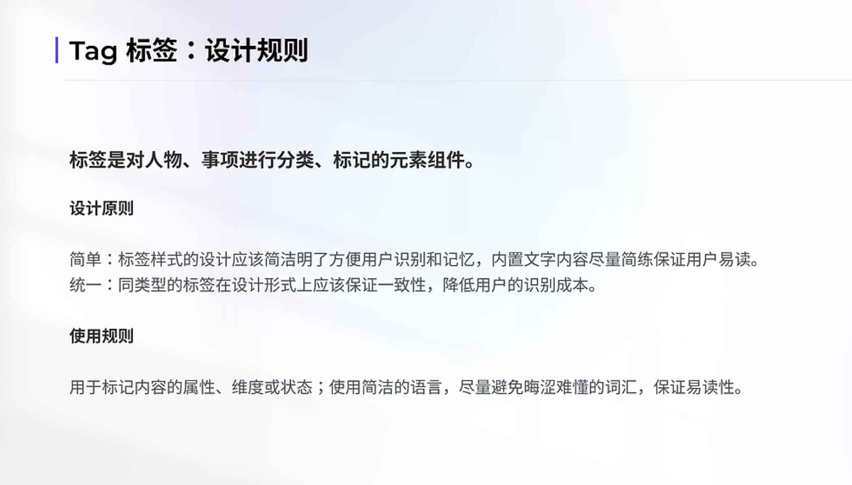 規(guī)范的最終目的是落地應(yīng)用,需根據(jù)不同產(chǎn)品場景明確標(biāo)簽的使用規(guī)則,讓設(shè)計師快速判斷適配類型。