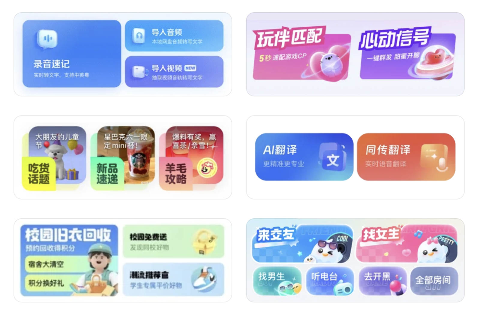 - 選1-2 個(gè)核心 / 高頻功能做大尺寸卡片,作為頁面視覺焦點(diǎn),強(qiáng)化用戶感知;