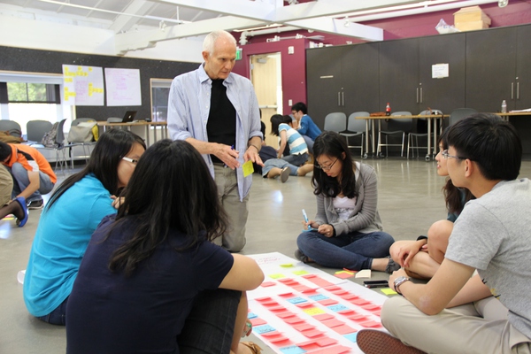 (圖為學(xué)員們?cè)贒.School用便利貼和海報(bào)紙來記錄想到的點(diǎn)子,白發(fā)老爺爺是D.School的講師,以前是Yahoo的PM,專門帶Ideate這一部分,講師們都有自己最擅長和最喜歡帶的一個(gè)模塊)