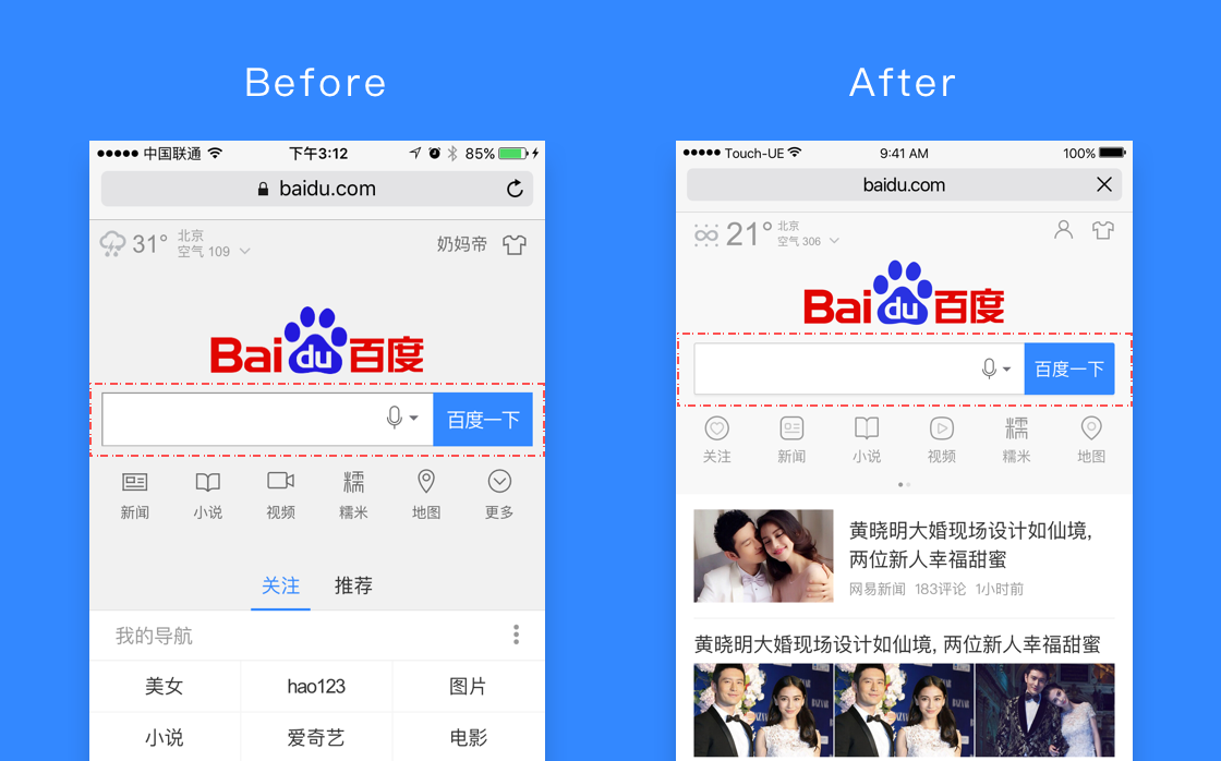 搜索導向-搜索入口的更好展現(xiàn)。搜索框作為發(fā)起搜索最直接的途徑,對它一點點的改變都是非常慎重的,在用戶對信息量需求激增的前提下,調(diào)整搜索區(qū)域與信息區(qū)域的占比變得尤為重要。運用黃金比例,將搜索框定位在一個最優(yōu)的比例上,同時保證信息展現(xiàn)的最大化。搜索框區(qū)域提升,內(nèi)容區(qū)域展現(xiàn)更多,滿足資訊需求。