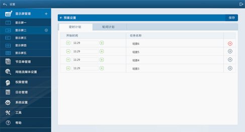 針對應用場景和特殊場景,可以進行不同的預案,設(shè)定不同主題的屏幕內(nèi)容和屏幕切換顯示的時間。