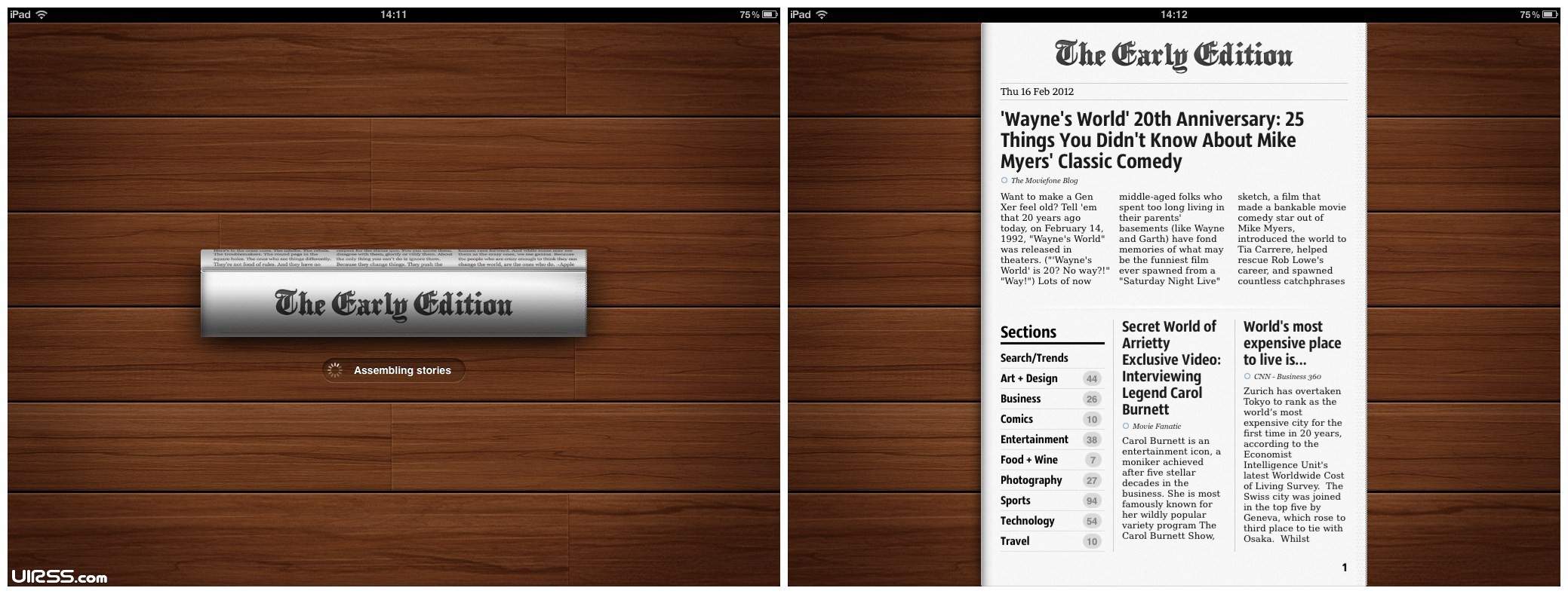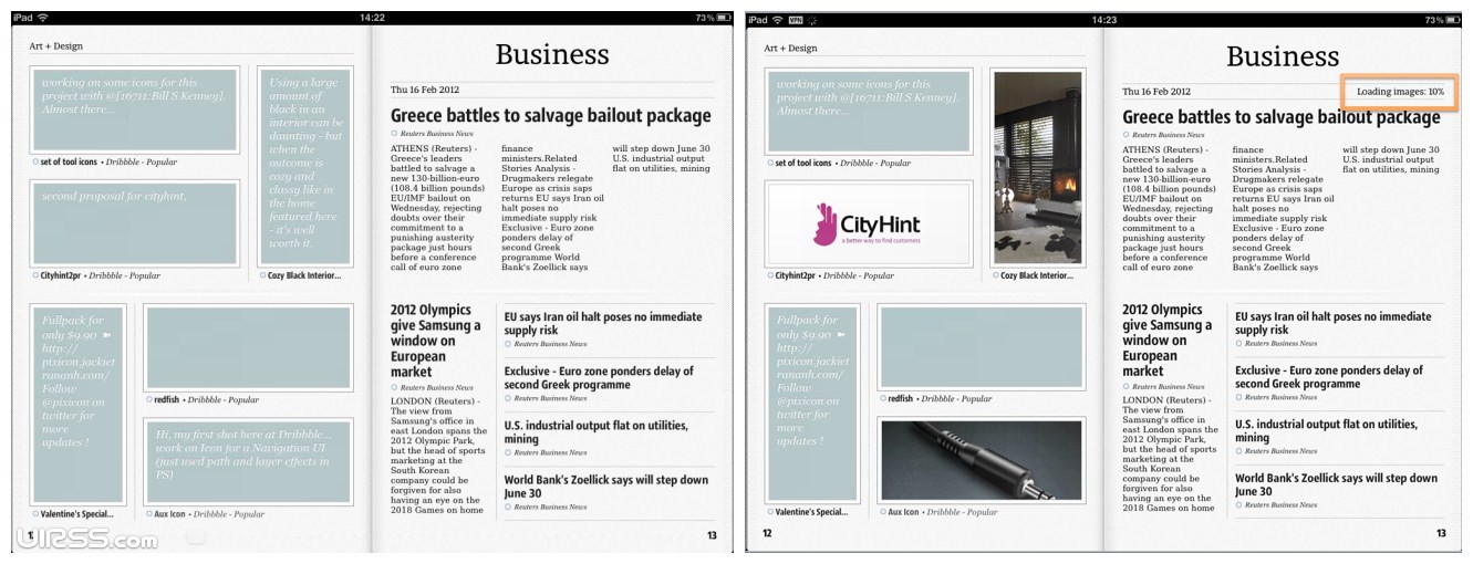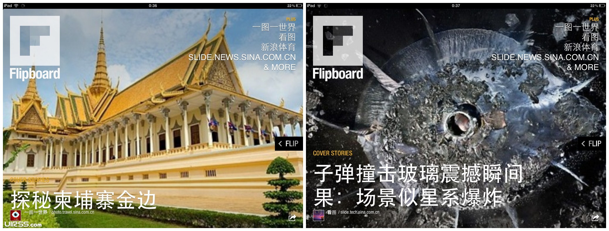 如Flipboard打開應(yīng)用時,cover從舊版的固定圖片變?yōu)槟阌嗛唭?nèi)容的圖片,在第一時間建立起閱讀內(nèi)容和用戶的聯(lián)系,在等待過程的同時閱覽正在更新的信息。