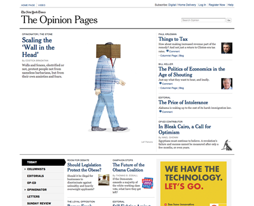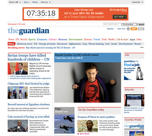 對于在線雜志或報紙一類需要呈現(xiàn)大量內(nèi)容的網(wǎng)站來說,要打造簡潔的頁面設(shè)計方案則更加困難。不過英國的衛(wèi)報(The Guardian) 以及一些同類型的在線報紙站點倒是向我們展示了通過固定寬度的網(wǎng)格布局實現(xiàn)簡潔設(shè)計方案的可行性: