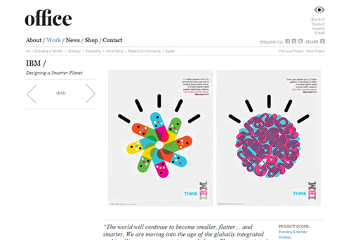 舉例來說,IBM的智能星球運動 (Smarter Planet campaign)涉及到多個方面的主題,與其相關(guān)的印刷品、插畫、圖表、人機互動素材等都遵從著同一套方案標(biāo)準(zhǔn),包括幾何框架、線條風(fēng)格、色彩飽和度等。無論是在網(wǎng)站,還是在平面媒體中,相關(guān)主題的視覺表現(xiàn)形式都具有高度的一致性。