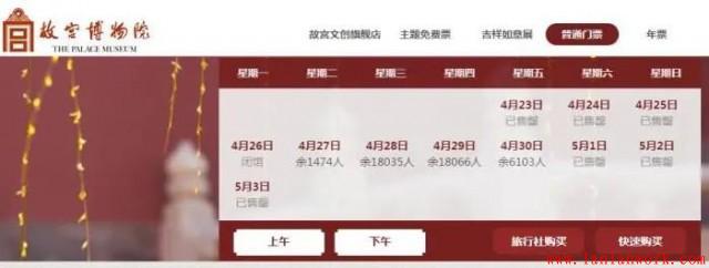 熱門景區(qū)門票售罄。記者4月23日登陸故宮網(wǎng)站發(fā)現(xiàn),“五一”假期前三天(5月1日至5月3日)的故宮門票已經(jīng)售罄。