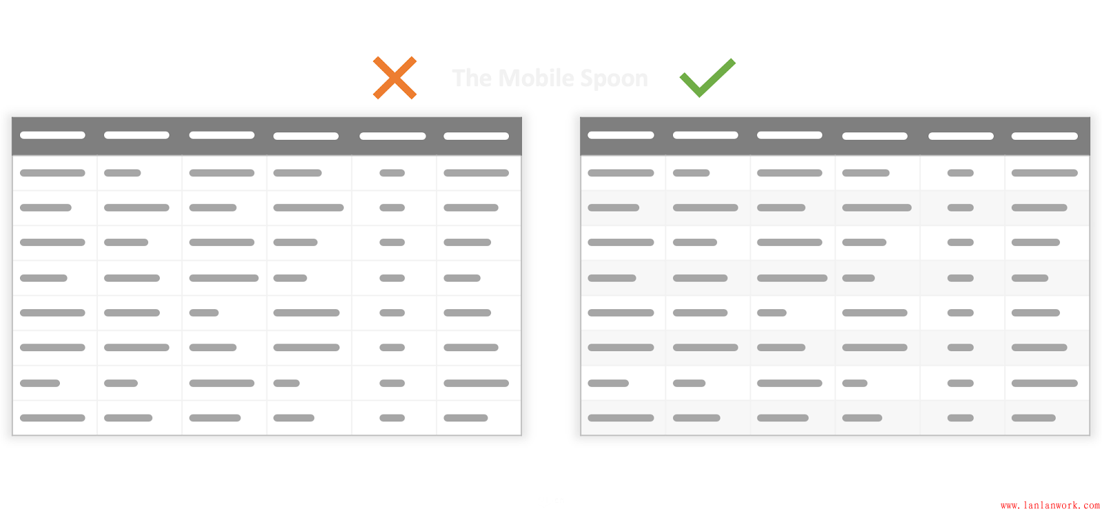 斑馬紋的表格可以幫助用戶保持其位置,但是彩色的行必須非常淺,否則會(huì)引起誤導(dǎo),看起來(lái)像選定的行。