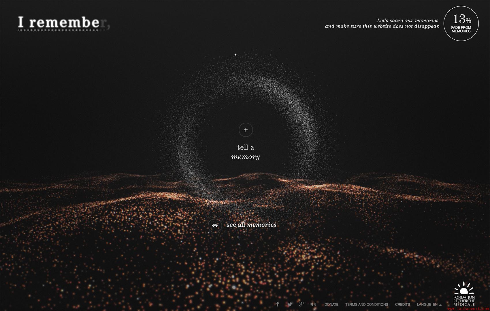 對(duì)于I Remember網(wǎng)站,主界面(動(dòng)畫)立即引人注目,因?yàn)樗?qǐng)互動(dòng)。雖然動(dòng)作和界面是功能性導(dǎo)航工具,但視覺設(shè)計(jì)師利用這些元素的潛在損失作為傳達(dá)網(wǎng)站潛在使命的方式:阿爾茨海默病。就像組織為其籌集資金的患者的褪色記憶一樣,如果沒有積極的互動(dòng),網(wǎng)站就會(huì)慢慢消失。