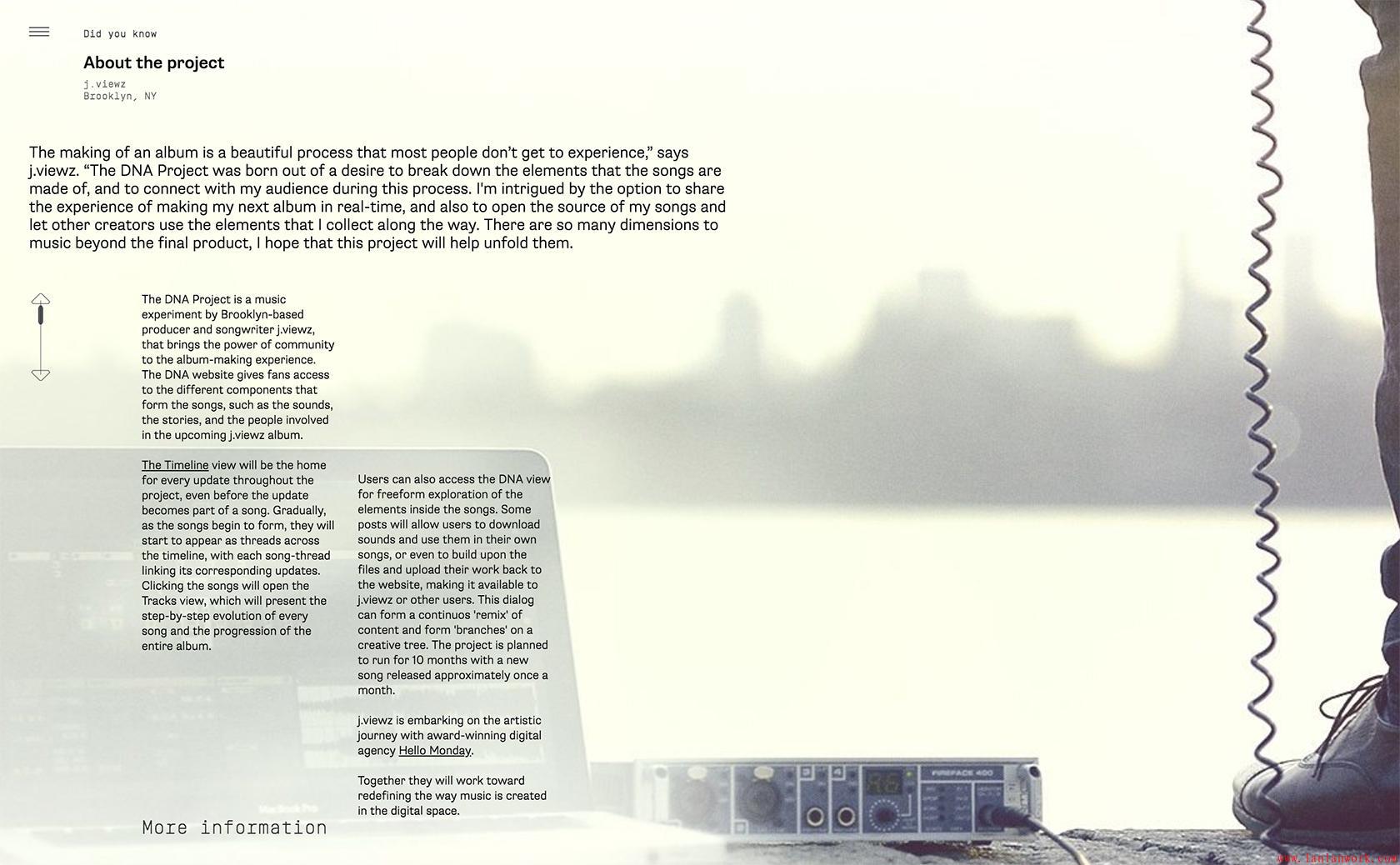 例如,DNA項(xiàng)目是一個(gè)使用一系列脫節(jié)層次結(jié)構(gòu)來傳達(dá)音樂家專輯創(chuàng)意結(jié)構(gòu)的網(wǎng)站。該網(wǎng)站的結(jié)構(gòu)很復(fù)雜,專輯的結(jié)構(gòu)也是如此。
