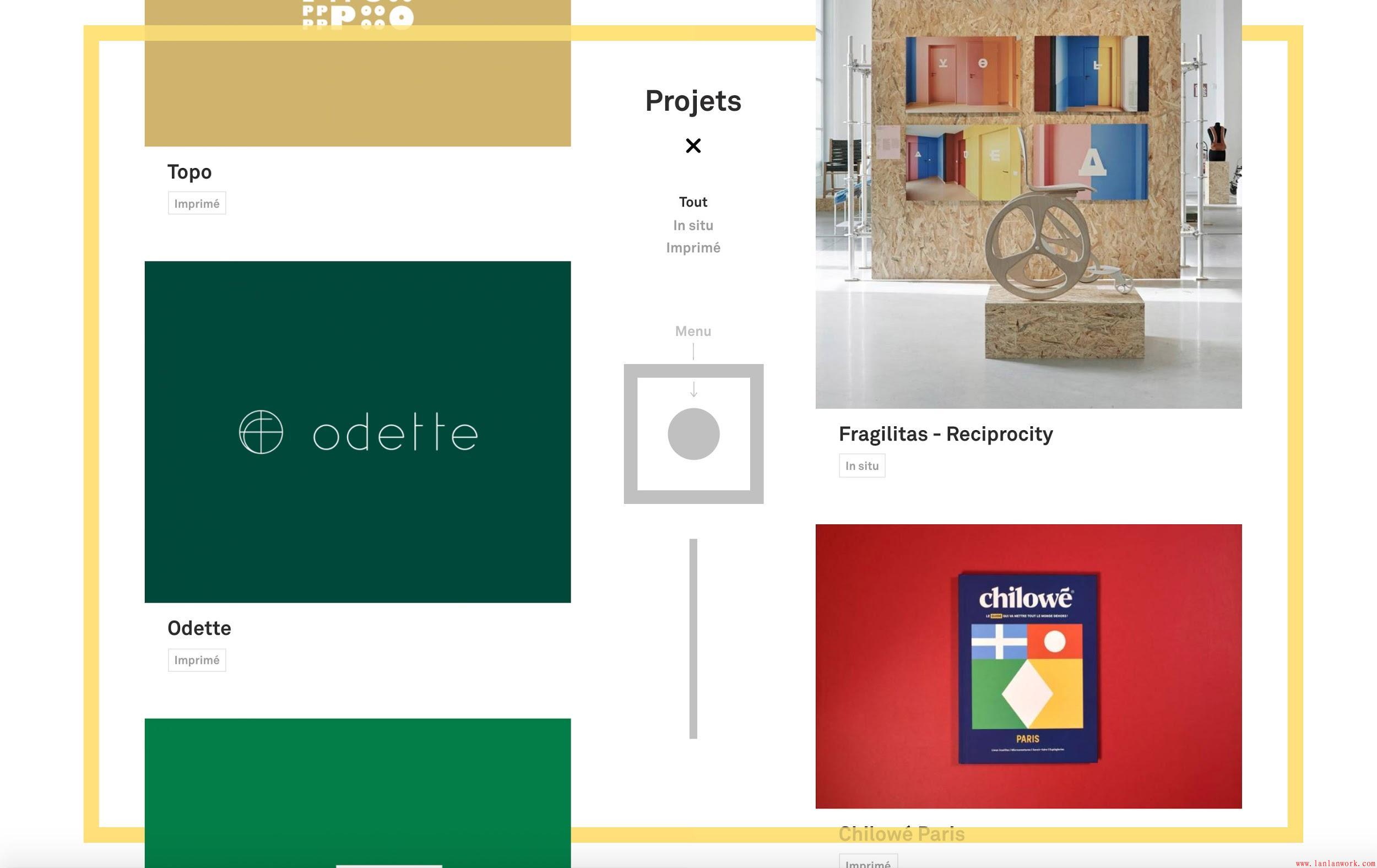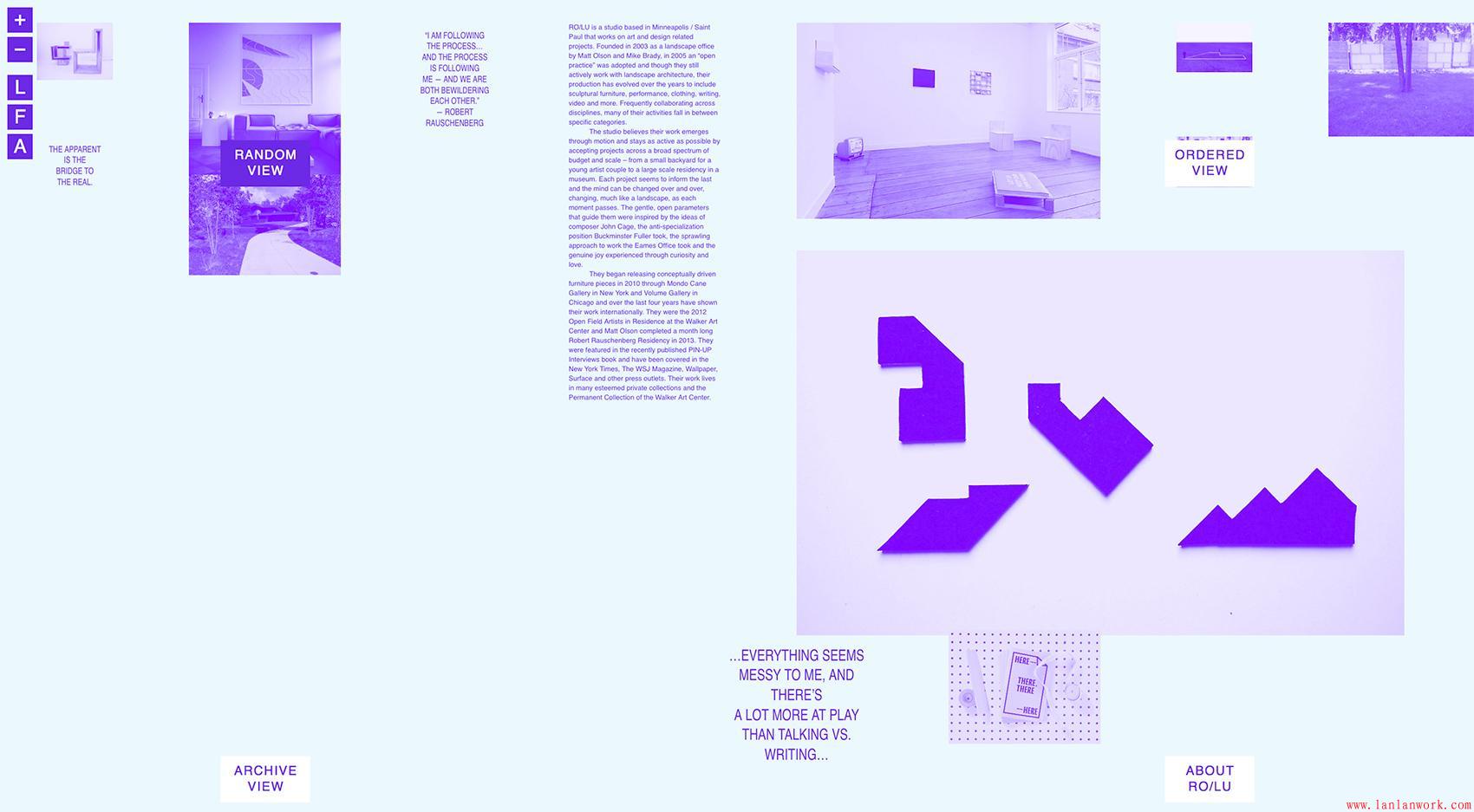 在大多數(shù)創(chuàng)意設(shè)計(jì)工作室的作品集中,作品沒有按層次組織,因?yàn)槊總€(gè)項(xiàng)目都是獨(dú)特的,并且被認(rèn)為同樣重要Ro / Lu網(wǎng)站的設(shè)計(jì)創(chuàng)造了一個(gè)動(dòng)態(tài)的構(gòu)圖,每次訪問都有不同程度的驚喜,并鼓勵(lì)觀眾調(diào)查工作室的廣泛組合。因此,設(shè)計(jì)工作室的折衷,跨學(xué)科性質(zhì)由內(nèi)容的隨機(jī)顯示。